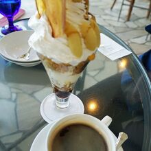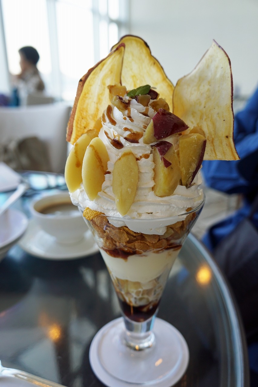 ホテルの特典で滞在中のコーヒーとすだちジュースが無料に。会員割引10%もお得。鳴門金時パフェが美味しく、景色も最高。