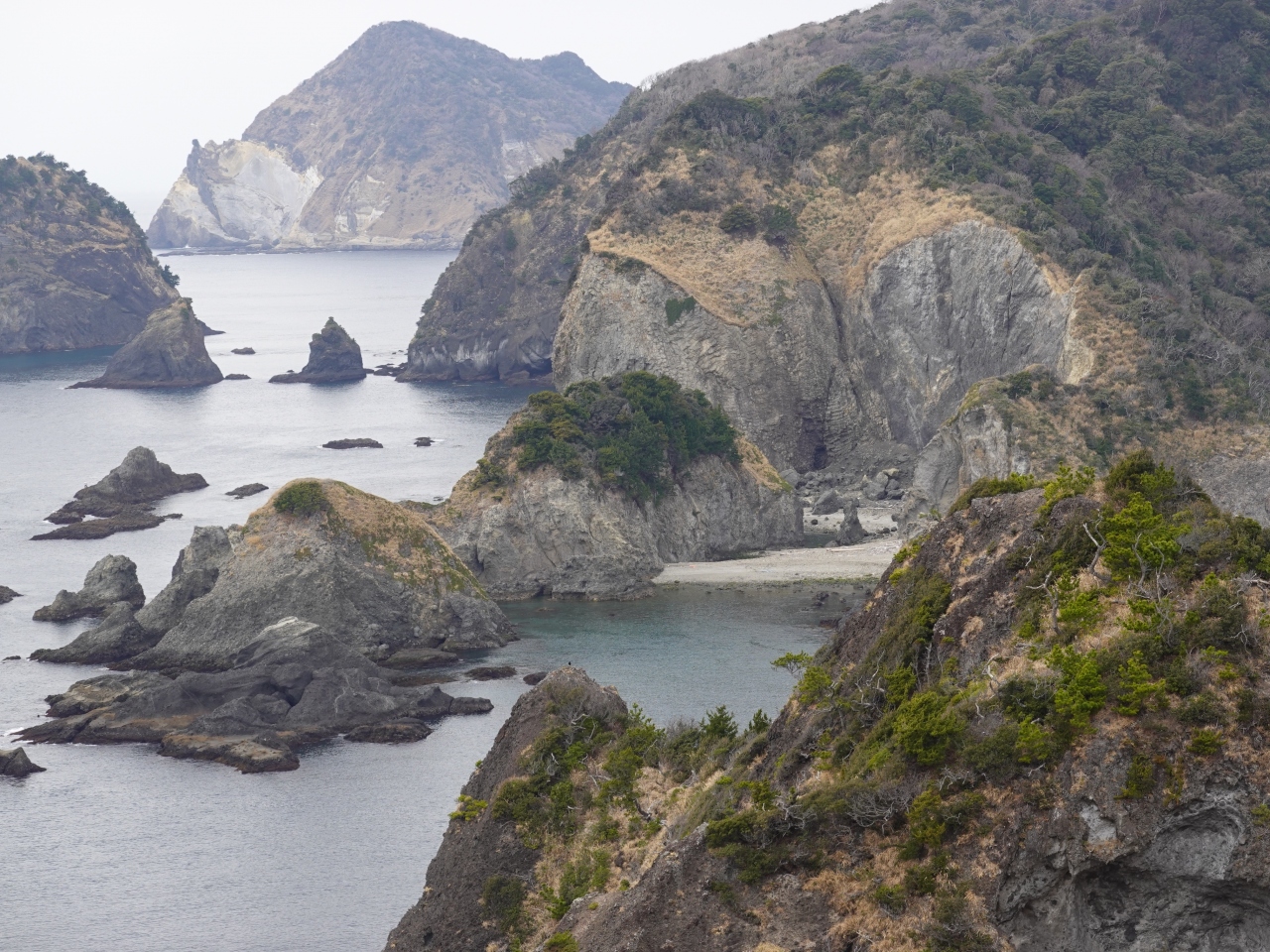国道136号線沿いにある「あいあい岬駐車場」に車を停めて、展望所や国道沿いの歩道を歩くと、奥石廊海岸の光景を楽しむことが出来ます。断崖絶壁と大小さまざまな島が点在する光景はとても印象深いものでした。石廊崎とともに南伊豆を代表する絶景だと思います。