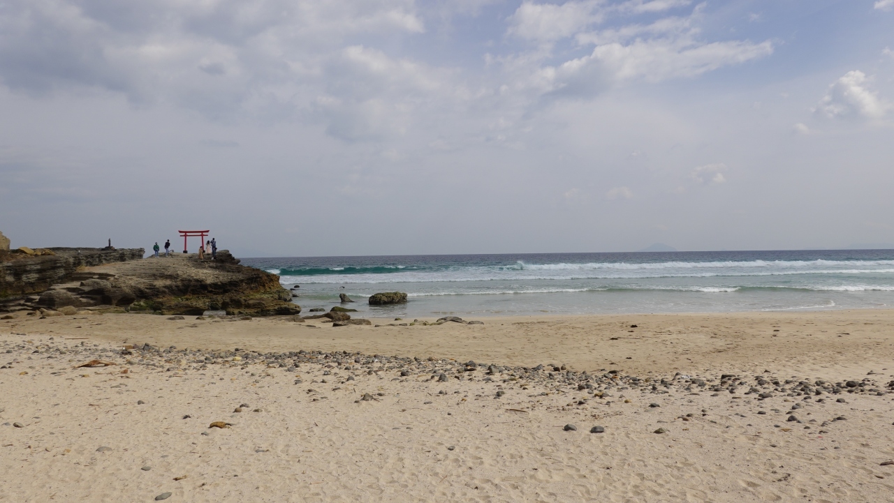 下田市の東海岸、白浜神社の南に広がる美しいビーチが「白浜海岸」です。砂浜側から海を眺めると、グラデーションがかかったように見え、とても印象的でした。ビーチ北端の崖の上には赤い鳥居が立ち、美しい海とのコラボレーションが最高でした。