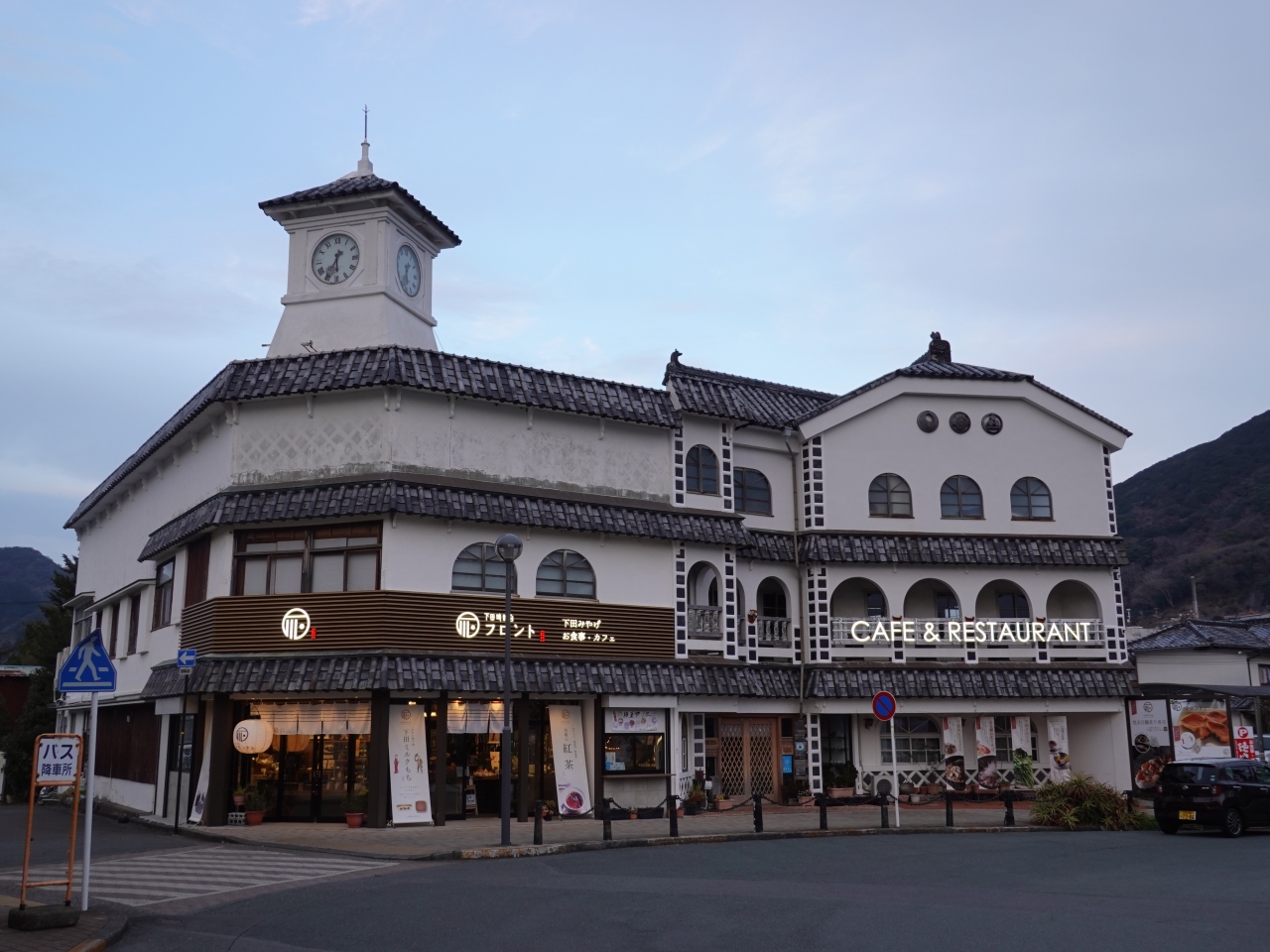 伊豆急下田駅を出て東へ向かうと駅前にロータリーがありますが、そのロータリーに面して建つ、時計台を有する建物が「下田時計台 フロント」です。こちらは、伊豆急下田駅開通と共に開業した歴史あるお店で、飲食の提供とともに土産物の販売を行っています。