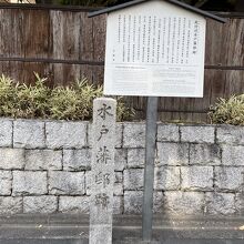 護王神社の北側に石碑と説明板が立っています。水戸藩は徳川家康の御三家の一つで、江戸時代にこの付近に水戸藩邸がありました。歴史は古く、1686年の地図「旧藩々上邸箇所」にも記されています。「大日本史」編集事業のため、京都にも多数の係員が派遣され、この藩邸を拠点として様々な活動が行われたとのことです。