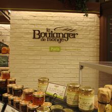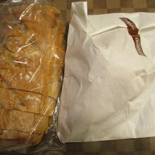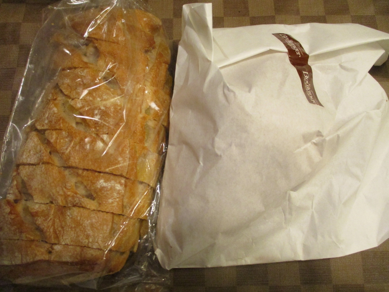 阪急百貨店の地下2階にあるブーランジェリーです。ラスクや一部の袋入りパンは自分でトレイにとれるようになっていますが、ほとんどの商品はケースに入っていて店員さんがとってくれるスタイルです。「ポムエノワ」というフランスパンとクロワッサンを買いました。クロワッサンは2種類あって迷いました。