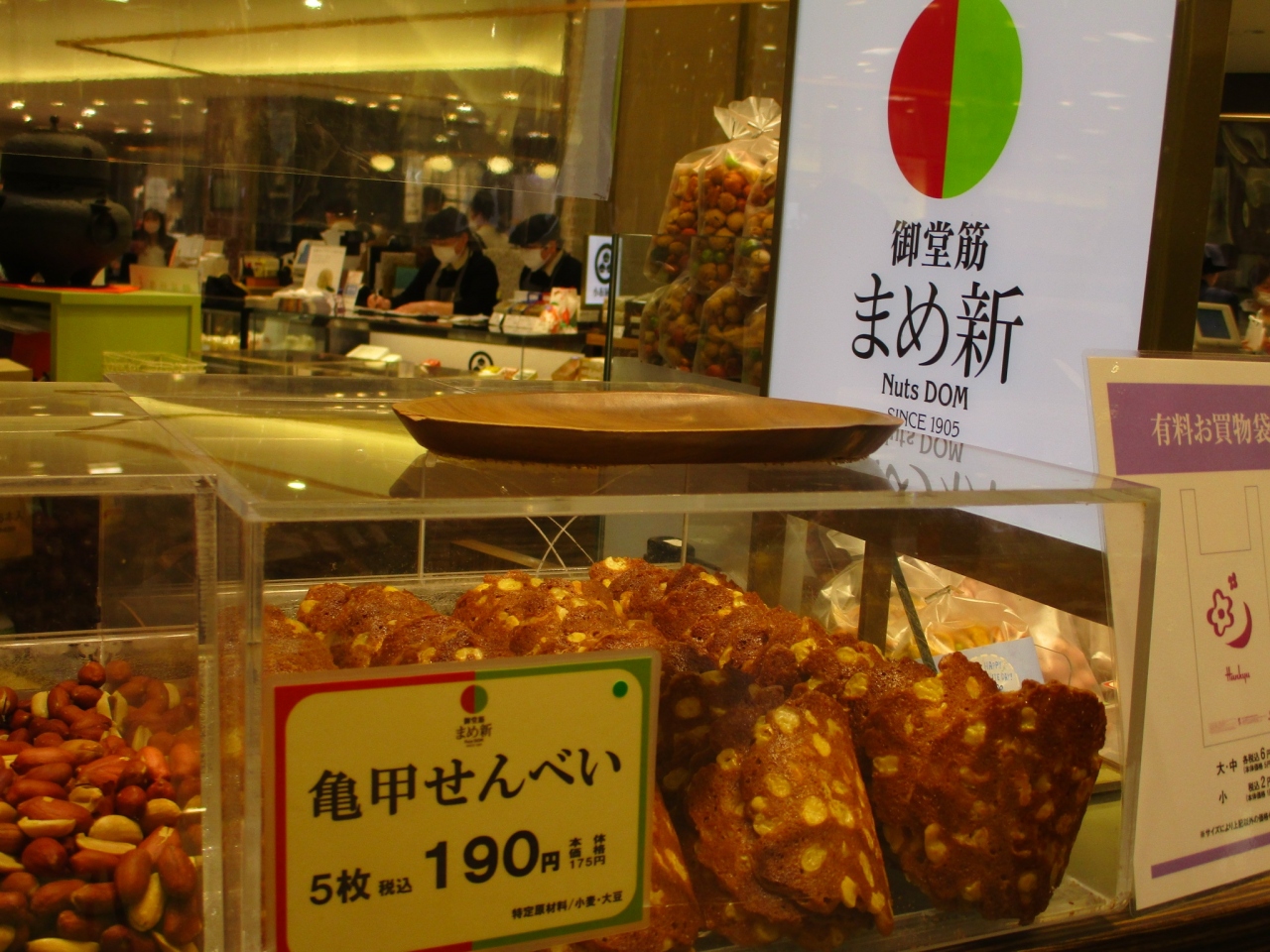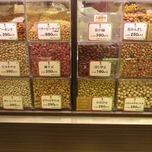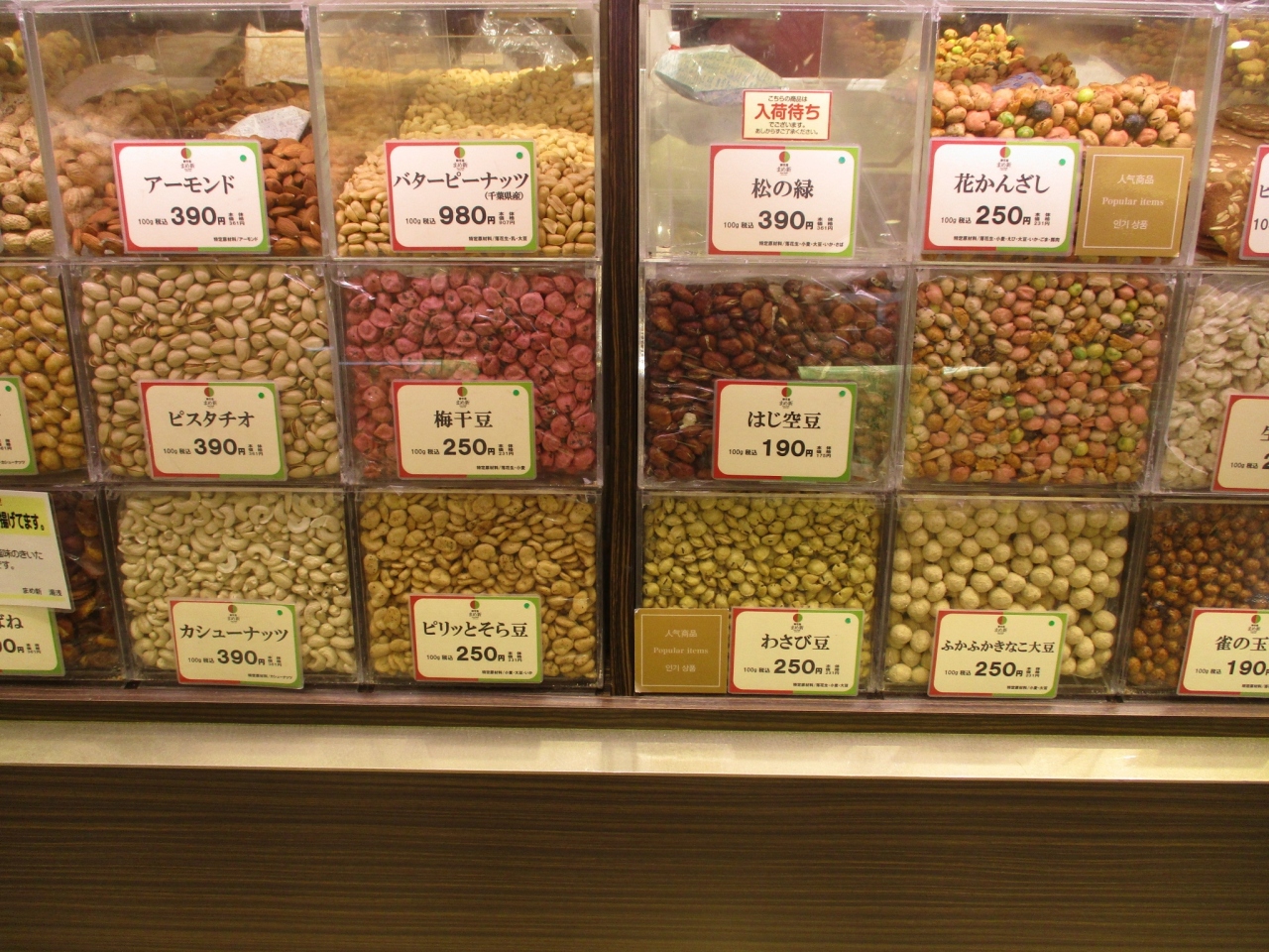 阪急百貨店のデパ地下は広いです。買い物中、豆の量り売りのお店を見つけました。仕切りのあるケースにアーモンド、バターピーナッツ、ピスタチオ、カシューナッツなど定番から梅干豆、花かんざしなどがそれぞれ入っています。量り売りってちょっと特別感があって買うのが楽しいです。