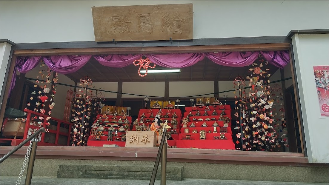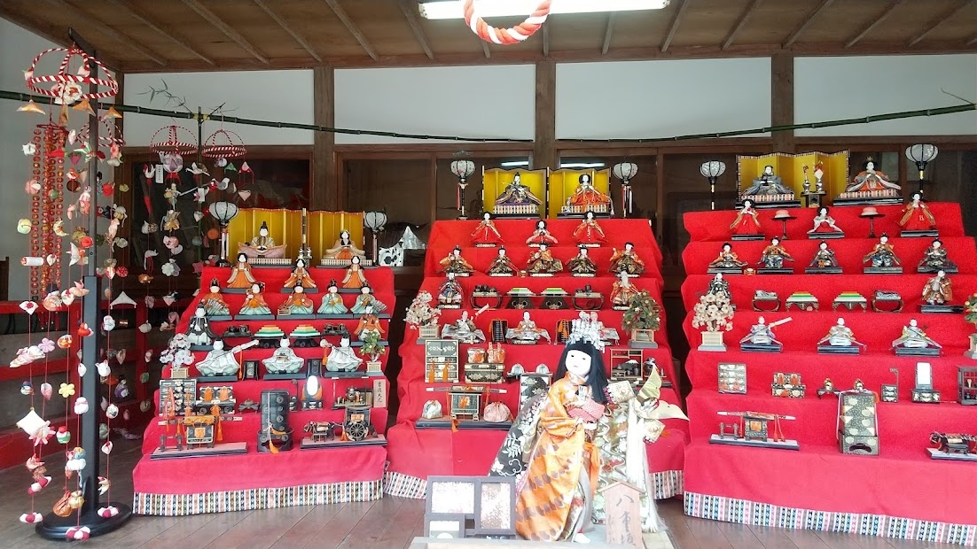 ここも雛のつるし飾り期間中はつるし飾り雛の展示が行われていて、本殿の隣に雛段とつるし雛が飾られ、静かに雛飾りを鑑賞することができます。無料で見られるのでお薦めスポットです。
