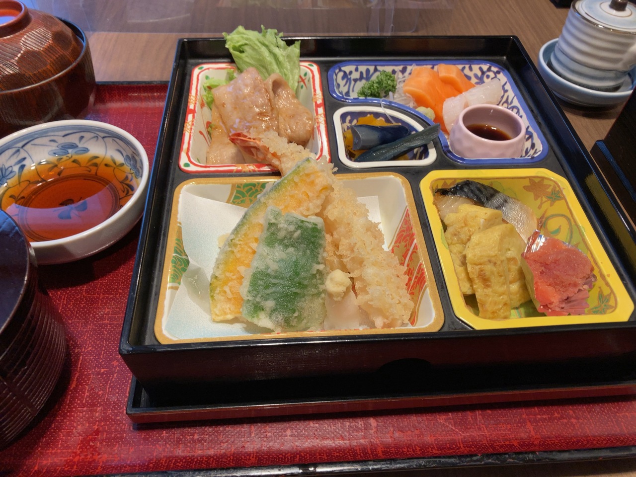 半年くらい前にも一度来ました、ランチタイムにまたお邪魔しました。平日の昼間だったからから、店内は地元のOLさんやおじさんたちで賑わっていました。今回は4つ切り弁当をいただきましたが豚の生姜焼き、天ぷら、お刺身、焼きサバ、卵焼き、明太子など内容盛りだくさんで900円!とてもお得でした。