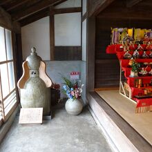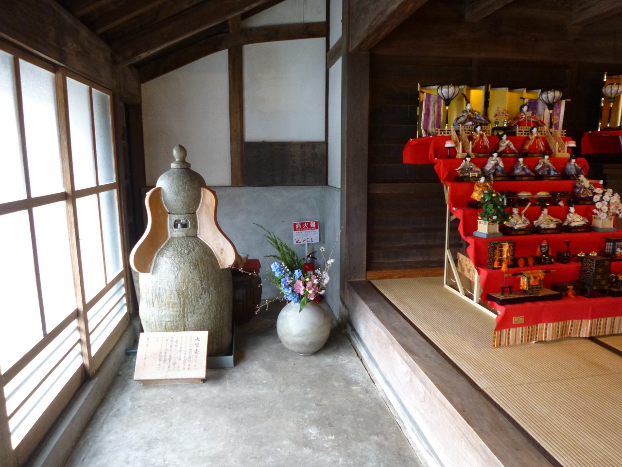 松崎町に残る、なまこ壁の家の一つです。明治43年に造られたもので、呉服商の商家だったそうです。内部を見ることができ、正面には帳場がありました。また、土間には多くのお雛様が飾られていて、大変華やかでした。裏手には更になまこ壁の土蔵が2棟あり、大きな商家だったことがわかります。