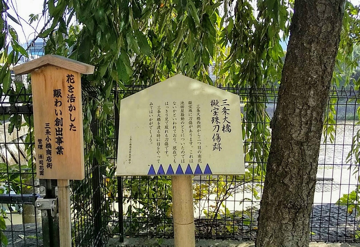 三条大橋に取り付けられている擬宝珠のなかに、池田屋事件のときに新撰組が付けたといわれる刀傷がある擬宝珠があります。