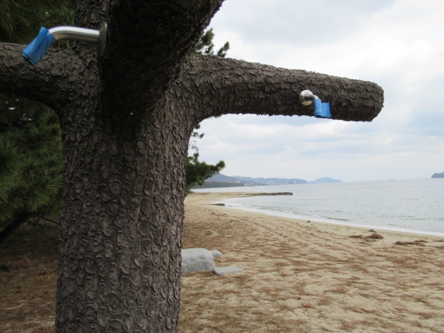 京都府北部の日本海側に天橋立海水浴場は綺麗で波は穏やかでした。松の木の新緑の中その陰でひと休みができ絶好の場所と言えるでしょう。写真を良く見てください。シャワーが松の木から出ていますよ。へぇー驚きです。天橋立らしさを感じます。