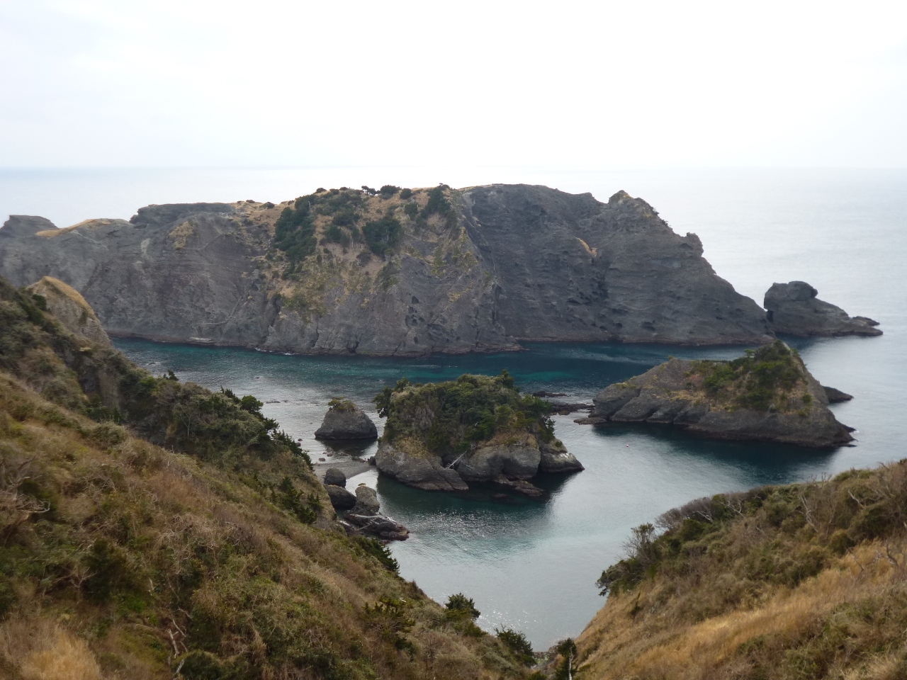 堂ヶ島方面から南下、あいあい岬に。ここは石廊崎の少し北側にあり、道路沿いに駐車場おあります。石廊崎に近い方に、ヒリゾ浜の案内が。曇りの日でしたが、上からのぞいてみると、大根島の手前に小さな浜と、きれいな海が。この場所より駐車場から少しだけ出た場所の方がきれいに見えました。