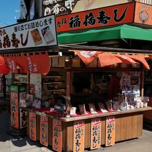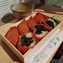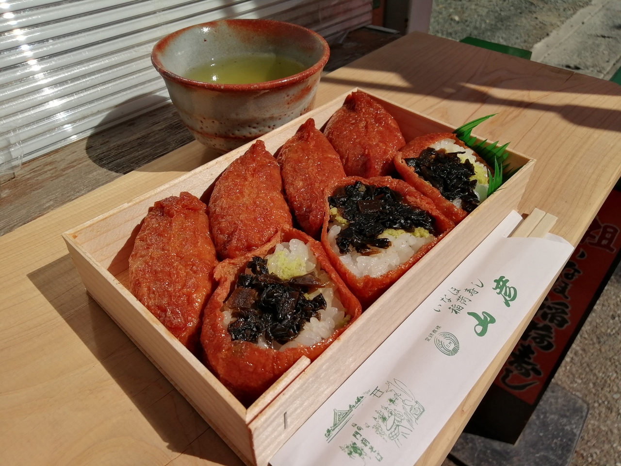 豊川稲荷のグルメといったら、やはりいなり寿司です。表参道にはいくつもの食事処があり、その店独自のいなり寿司が食べられます。どれも気になりますが一回ではすべてを食べ比べられないのが残念。なので一番の有名店「門前そば山彦」のものをいただきました。店先で売られている持ち帰り用の「ミックス(税込780円)」(五目稲荷4個、わさび稲荷3個入り)を購入。お揚げはかなり味が染みており甘辛いです。やはり、わさび稲荷がおいしいですね。