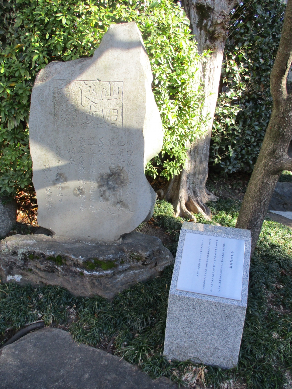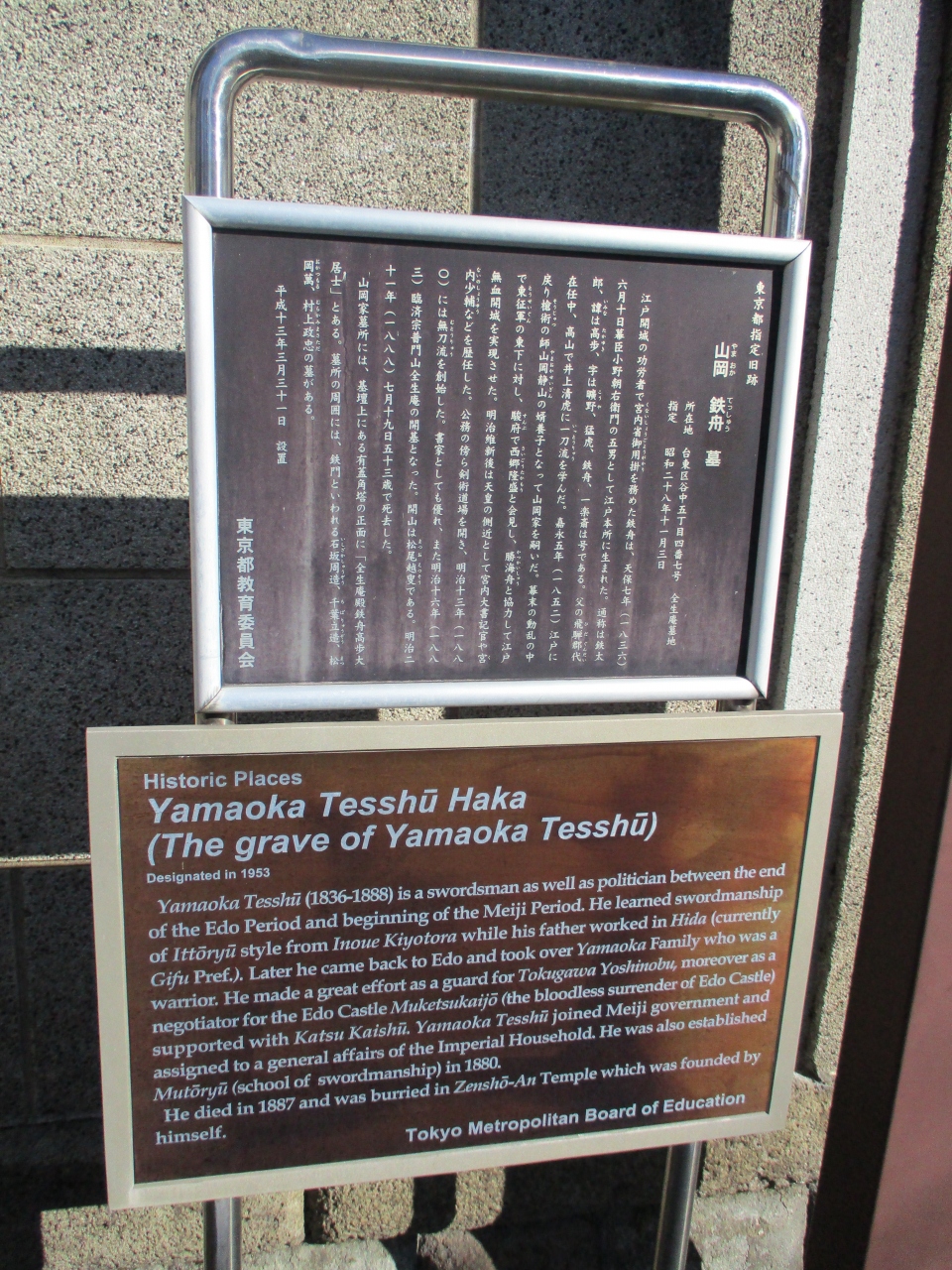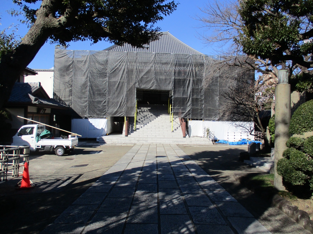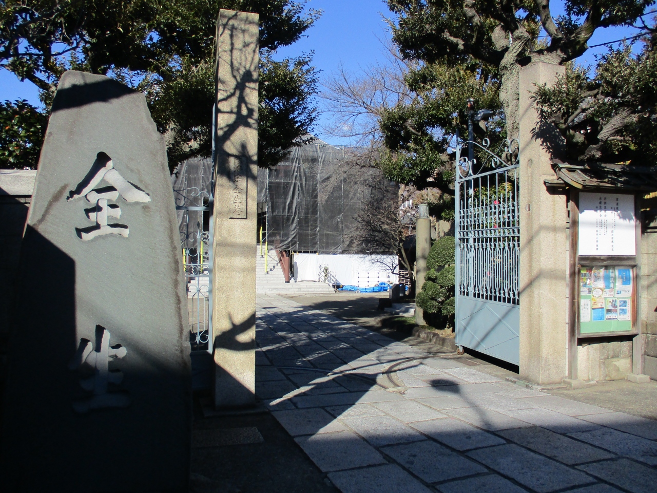 谷中5丁目界隈を散策していて立ち寄ったお寺です。お寺に入る脇に案内板が立てられていて、江戸末期の幕臣、山岡鉄舟や、有名な童謡作曲家、弘田龍太郎のお墓あると書かれていて、歴史あるお寺なのだと思いました。境内に入るとちょうど本堂は工事中で残念でしたが、石碑や鐘楼もあって雰囲気のあるお寺でした。