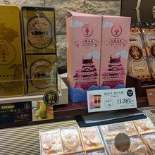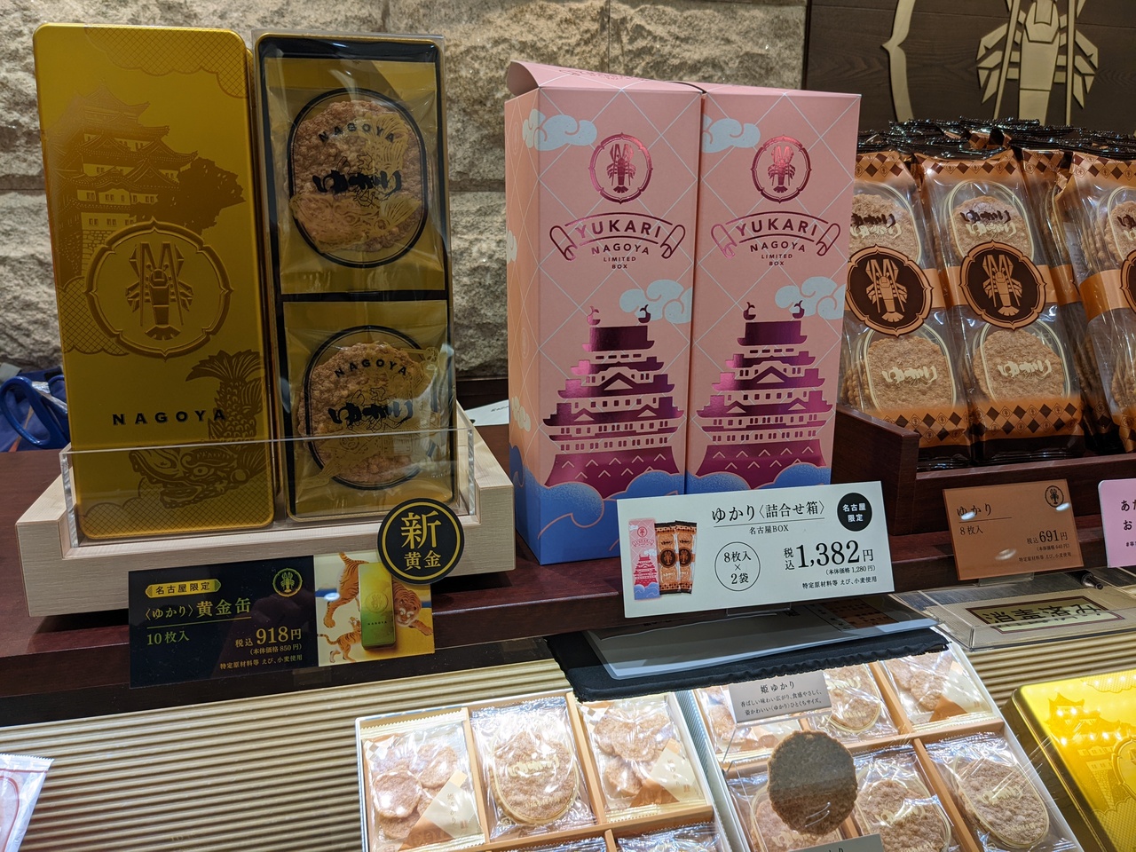 松坂屋名古屋店本館(地下1階)にある「坂角総本舗」のお店です。愛知を代表する海老せんべい「ゆかり」は、香ばしく、海老の旨味も凝縮されていて美味しいです。こちらのお店では、名古屋城が描かれた無料の箱に入れてもらうこともできるので、おみやげにも最適です。