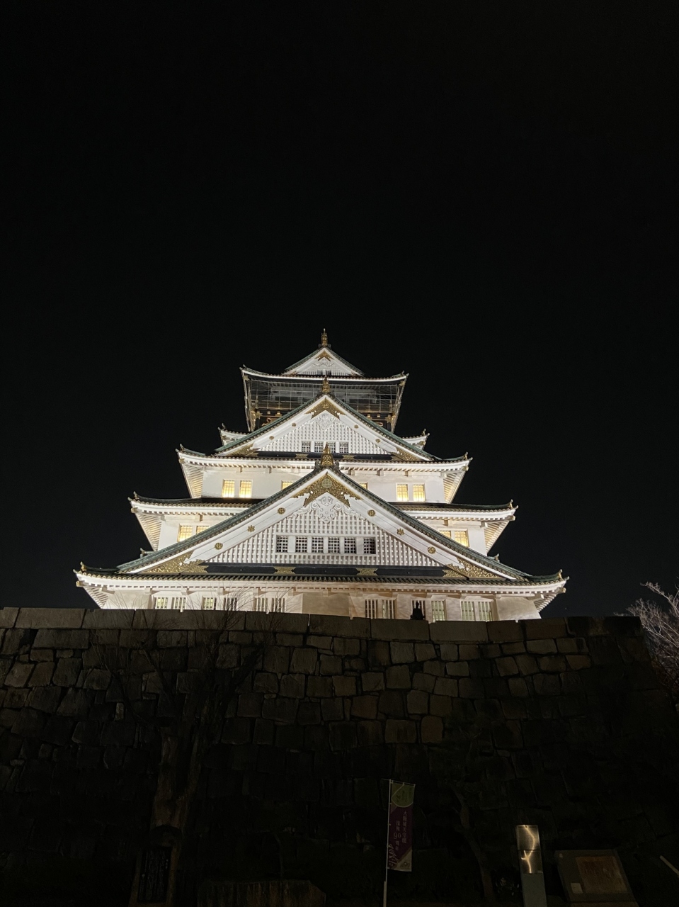 夜の大阪城に行ってきました。天守閣の中に入る事は出来ませんが、大阪城公園は24時間出入りが自由なので、ライトアップを楽しむ事ができます。真っ黒な空に真っ白な天守閣が浮かび上がるのはとても幻想的で美しいです。