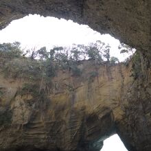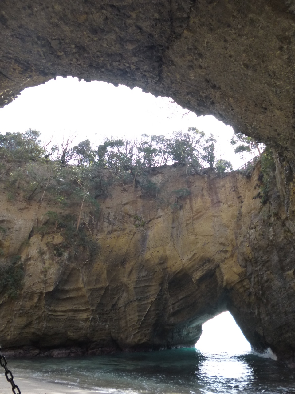 下田から南へ行ったところ、田牛海水浴場の近くに、龍宮窟があります。道路沿いに15台ほどの駐車場があり、係りの人が誘導してくれます。入場料などはいりませんが、駐車場代が500円かかります。コースは、階段を下りていき、洞窟を下から眺めるのと、上に上がって、上から洞窟を眺めるものです。上から見ると、確かに穴がハート形になっていました。