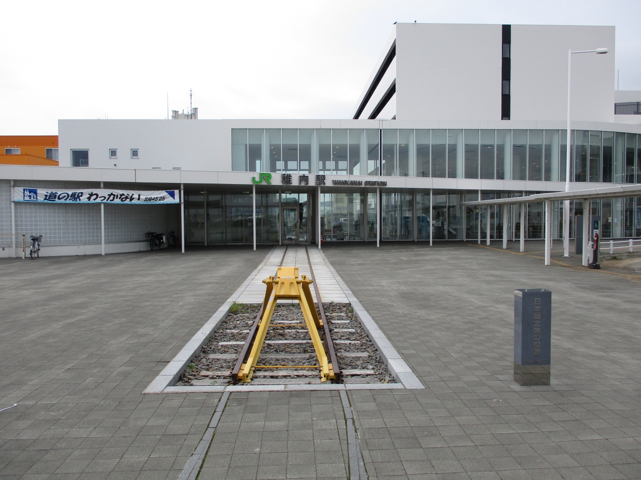 JR稚内駅を出たところに設置されたモニュメントでした。駅舎内から線路がずっと続いているように見え、車止めと隣接して、「日本最北端線路」と記されていました。線路自体は、その先も駐車場方向へつながるようにデザインされていました。