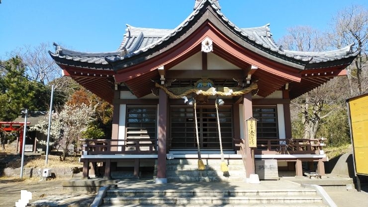 境内は高台にあり、広めの境内は複数の境内社を有していた。梅も咲き始めており、2月下旬の時期、春を感じることができた。