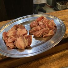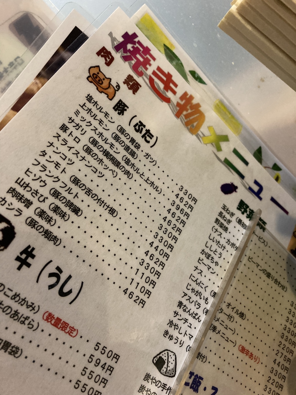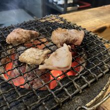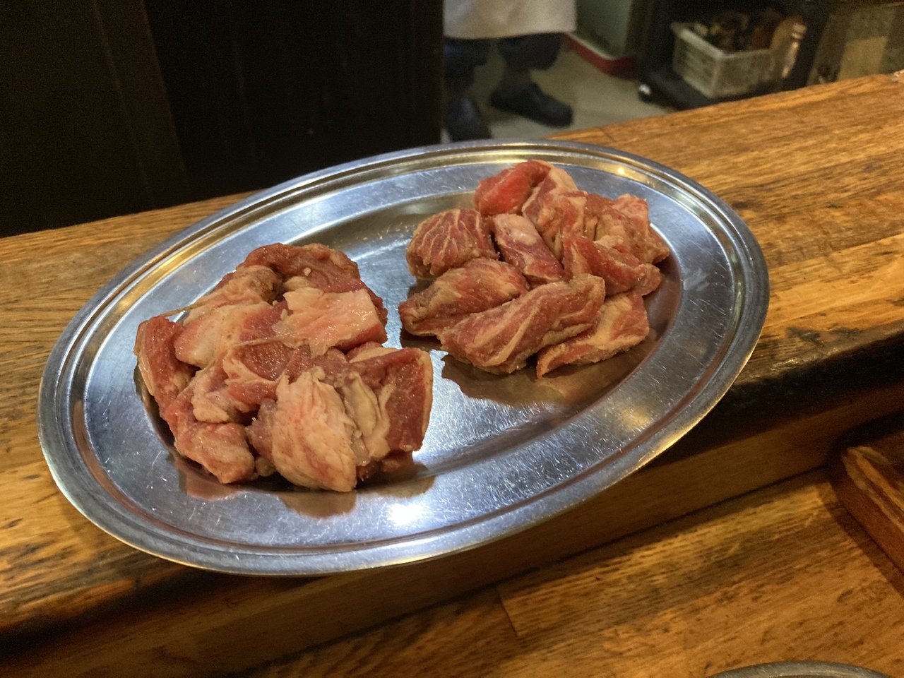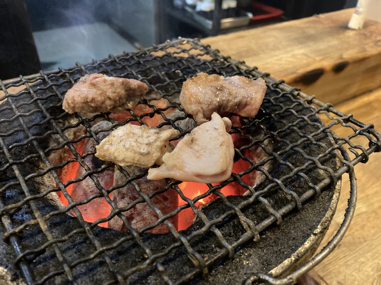 七輪の炭火で、それぞれがお肉を焼くスタイルは他と同じ。塩ホルモンと上ホルモンの入ったミックスホルモン、牛カルビ、生ラムをオーダー。本当は、サガリとレバーも食べたかったのですが、既に品切れ。仕方がなく、ミックスホルモンを二人前にしました。ミックスホルモンは、さすが超新鮮。お酒を飲まなければ、白飯を何杯でもいけそうな感じ。秘伝のタレは少し濃いめ。捌くときにきちんと処理されているので、全くクセがない。脂っこくないので、七輪から火が出ることもない。適度に脂が落ちる。牛カルビは大きくジューシー、生ラムもジンギスカンで食べるのとは異な理肉の味がわかります。