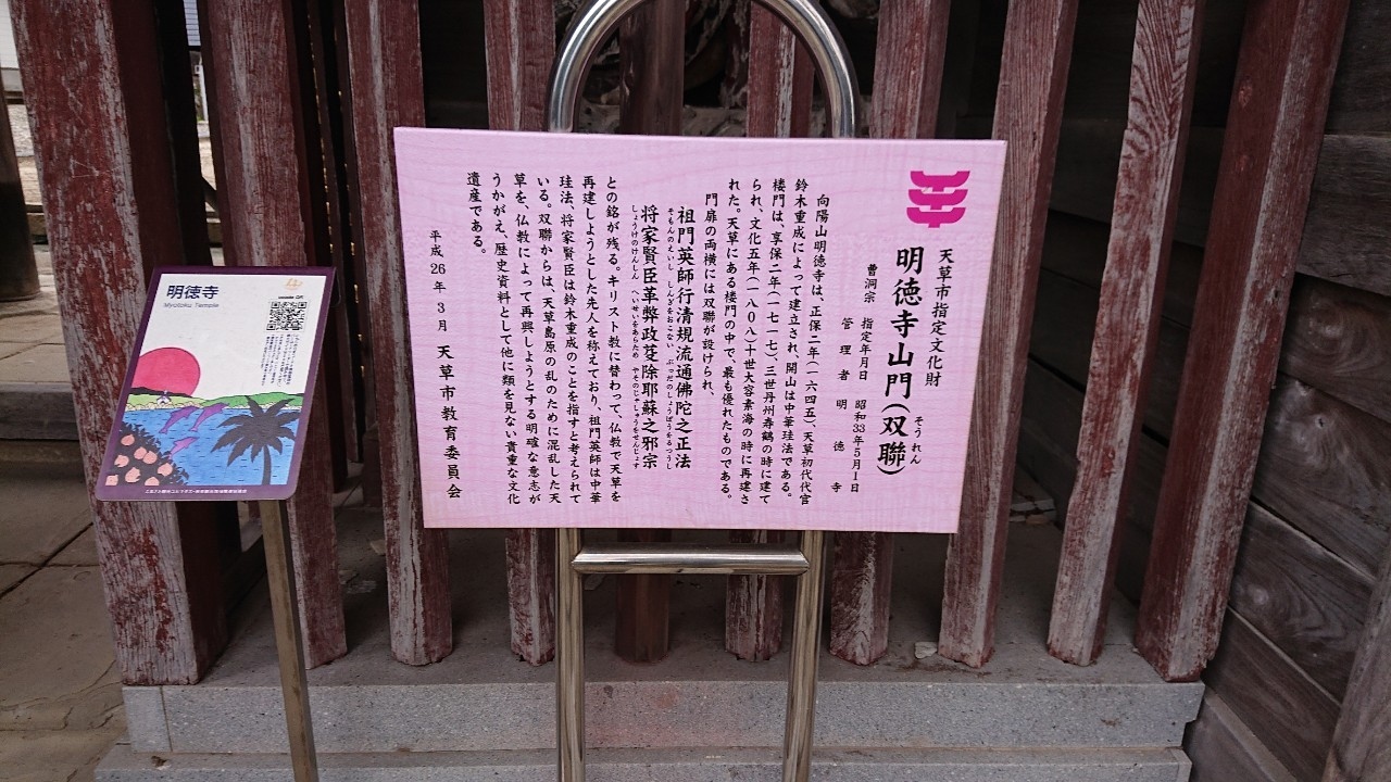 天草は、教会も歴史的な価値な雰囲気がとてもよいですが、神社やお寺も立派です。こちらの明徳寺も、とても立派な山門があります。400年近い歴史があり、建物もとても大きく迫力に圧倒されます。東日本とは建築様式が少し違う感じです。