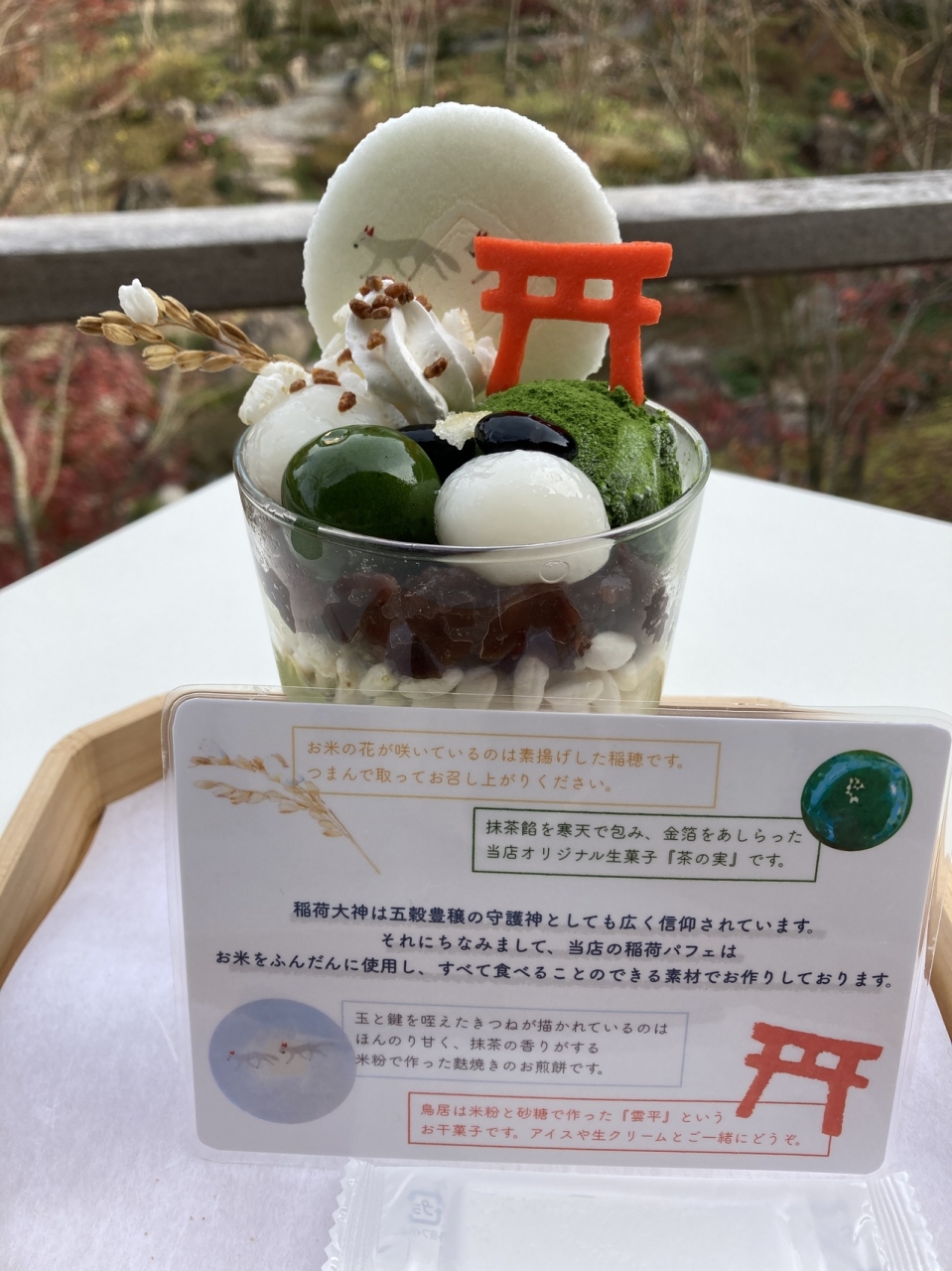 伏見稲荷内にある比較的新しいカフェ。テラス席では気持ちのいい眺めを楽しみながら、抹茶をベースとしたドリンクやスィーツを楽しむことができます。私が今回注文したのは一番人気と言っても過言ではない稲荷パフェ!見た目の可愛さはもちろん、素材にこだわったパフェは装飾まで全て食べることができお米の自然な甘さやさまざまな食感が楽しめるクオリティー高い一品でした。少し高めですが立ち寄る価値のあるカフェです。