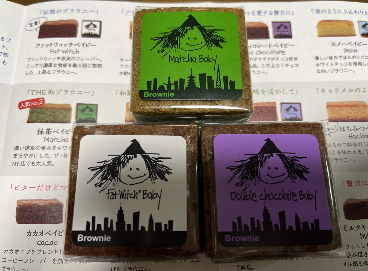 NYに行ったらかならず買って帰っていたファットウィッチのブラウニーが代官山に出店したと聞いて行ってきました。お店がガラス張りで通りから店内が見えたのですが、小さなお店で店員さんが一人いるだけでした。様々なフレーバーがありましたがとりあえず定番のものを3種類買い、計1134円でした。自宅でさっそく食べてみましたが、あのNYの外はかりっとさくっと、中はしっとりもっちりの感じがうすく、食べ応えがないような…見た目は可愛く、個包装なのでお土産には良いかもしれませんが、個人的にはNYに行ったときに買えばいいかなと思いました。