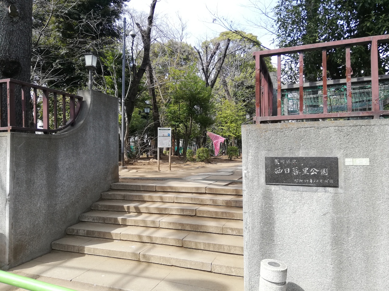 西日暮里駅の 高台の丘の上にある普通の公園である。 しかし、かつては太田道灌の砦であり または青雲寺の境内となり 加賀藩主前田家の墓地など 重要な役割を終え、今の西日暮里公園となる。 富士見、月見、虫聴きなど風光明媚な趣な遊びを江戸時代の人はこの地で 楽しんできた。