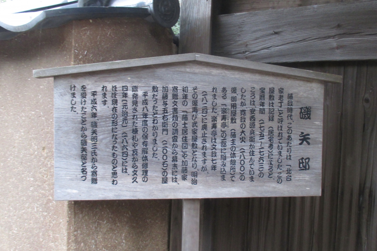 この建物は藩主の休息所だった楽寿亭の一部で、玄関の間、客間の座敷、茶室の三部屋が残っているとのことです。藩主が休息するところですから、お庭には趣向を凝らし、その先に拡がる景色は眺望が利き、建物は各所に意匠を凝り・・・と、杵築の中で最高の癒やし空間だったのでしょうね。なお、このお屋敷の名になっている磯矢家は、家老などの重役だった家柄ではなく、市に寄贈して戴いた時の所有者だったそうです。
