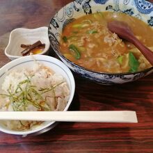 平日の11時半すぎに伺いました。すでに常連と思われる近隣の会社員の方たちが数名いらっしゃいました。カレーうどんと色めし(かやくご飯)のランチセット700円をオーダーすると、まもなく運ばれてきました。なかなか早いので有り難いです。きゃらぶきとたくあんも付いてきます。コスパよしです。
