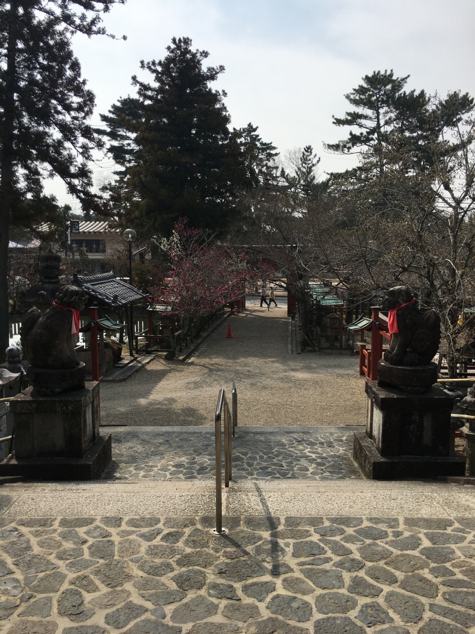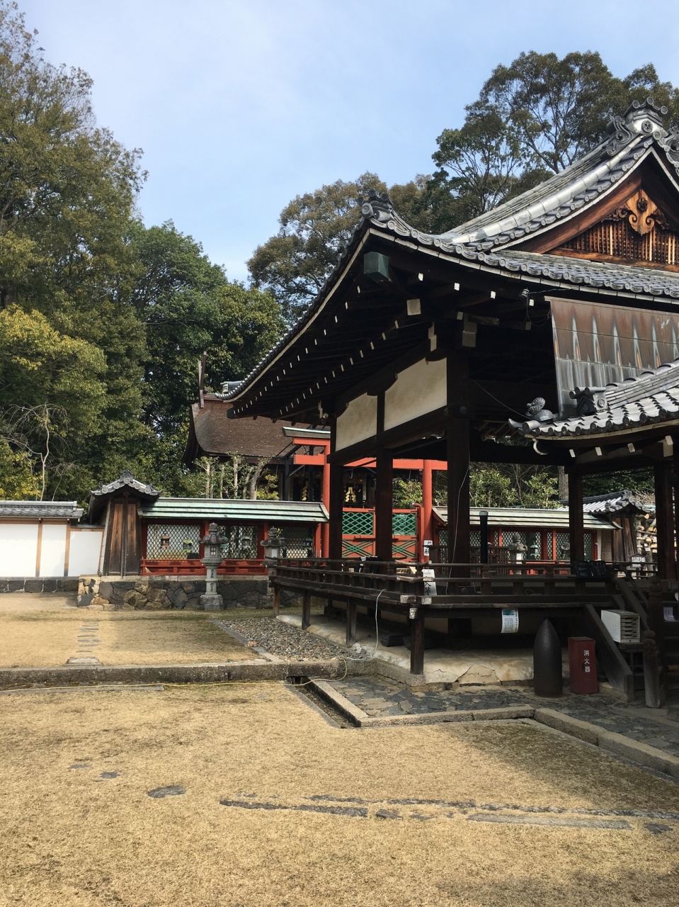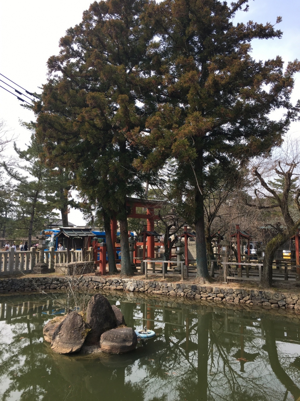 奈良県庁がある大通り沿いにあり、奈良公園の前で、歩いている人は東大寺には向かう人が多いので、立ち寄る人も少なそうな感じの神社でした。鳥居を潜り少し歩くと階段で表門の前には年季がある獅子の像がありました。能舞台のような建物の後方に社殿があり、境内には池もありました。