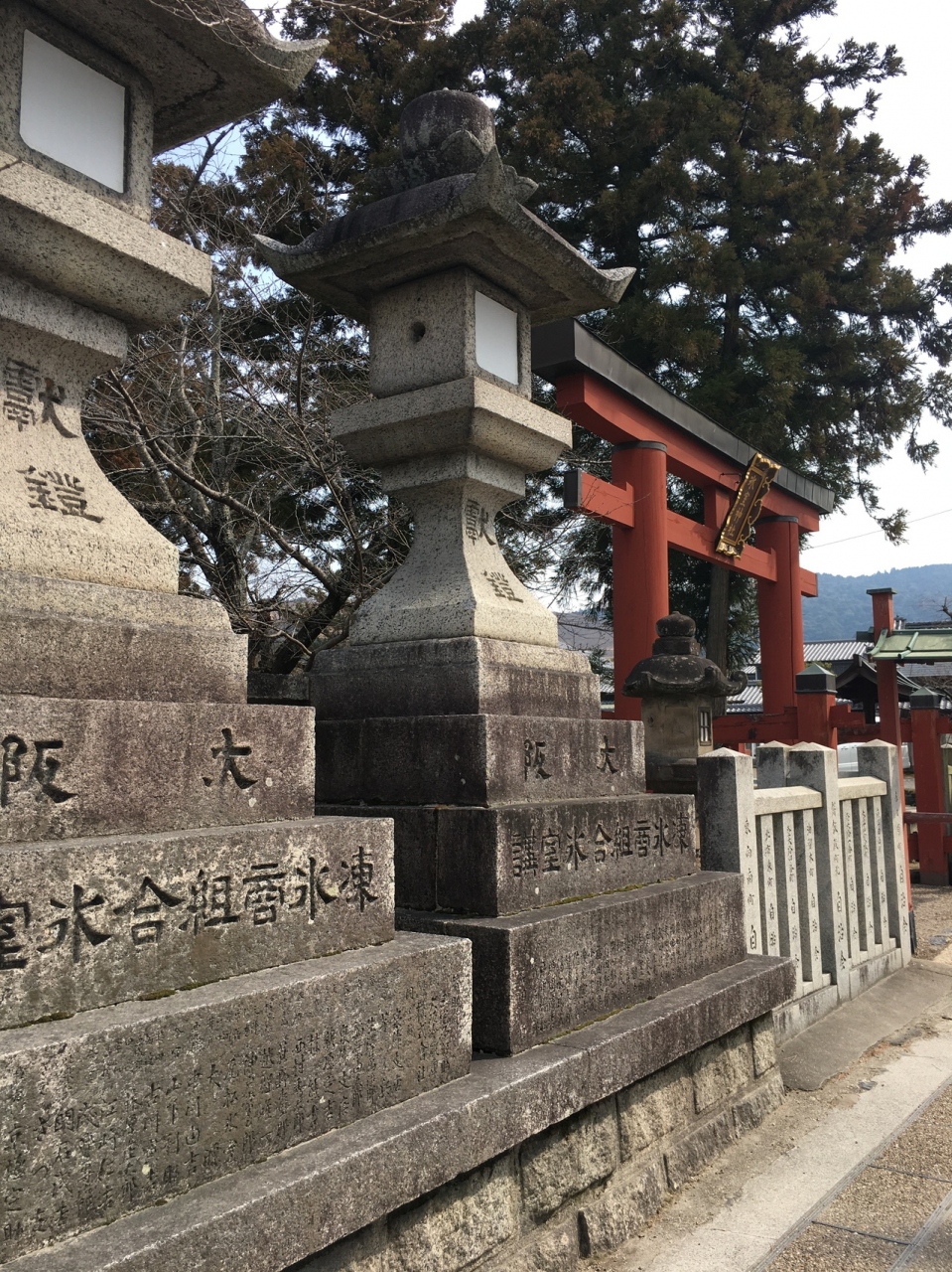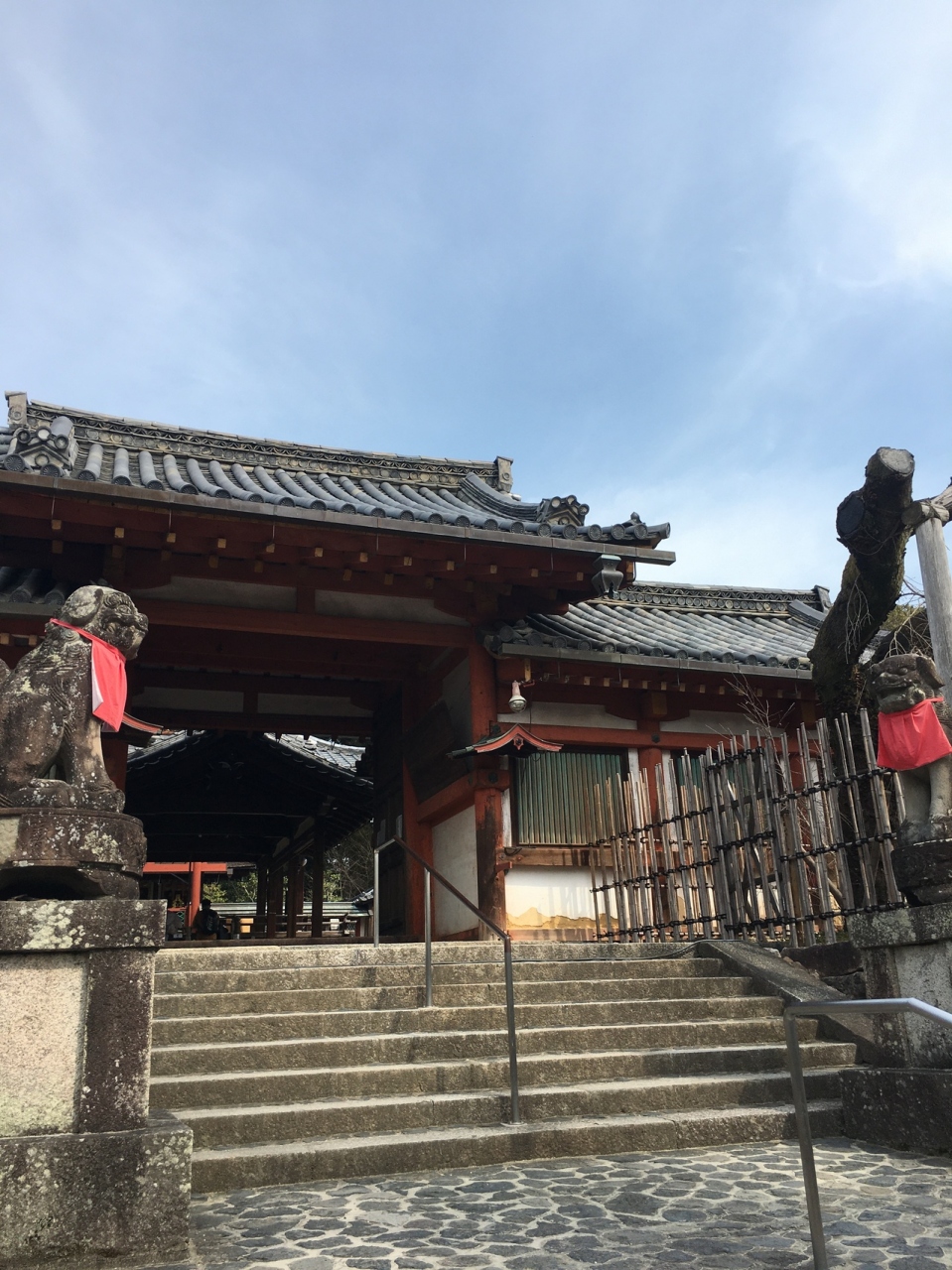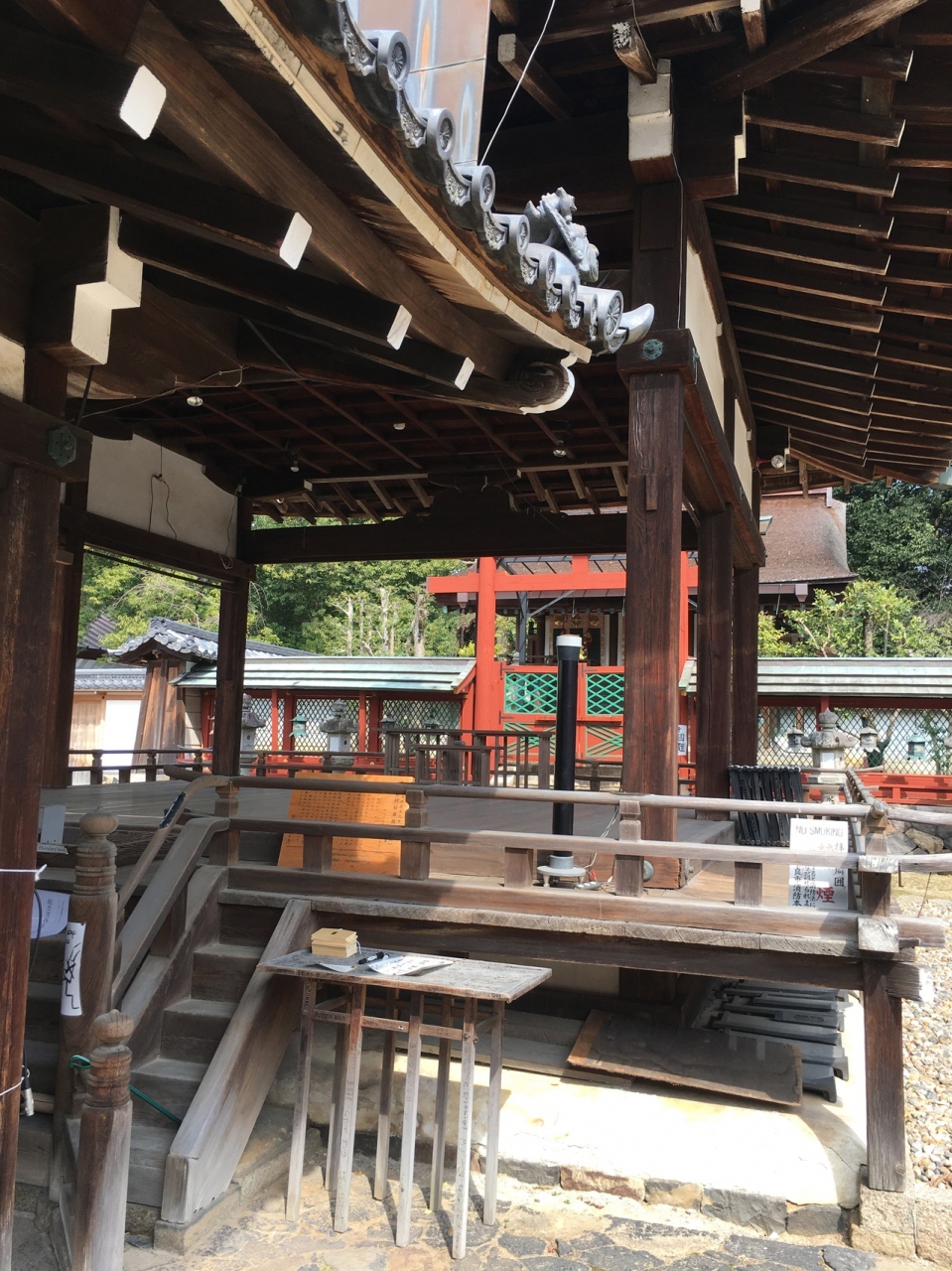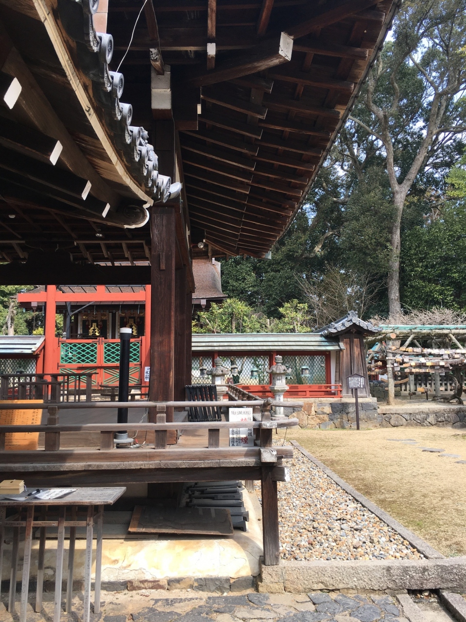 奈良県庁がある大通り沿いにあり、奈良公園の前で、歩いている人は東大寺には向かう人が多いので、立ち寄る人も少なそうな感じの神社でした。鳥居を潜り少し歩くと階段で表門の前には年季がある獅子の像がありました。能舞台のような建物の後方に社殿があり、境内には池もありました。