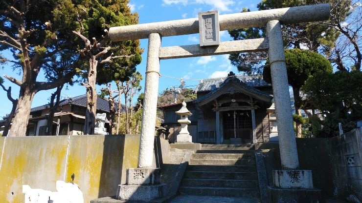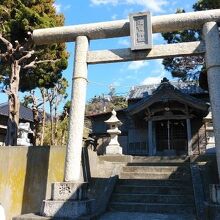 県道沿いに古い木造の建物があり、その脇にある階段から境内に入る。鳥居は海側に建立されていた。付近は交通量が多いが道幅が狭く歩道がないので注意。