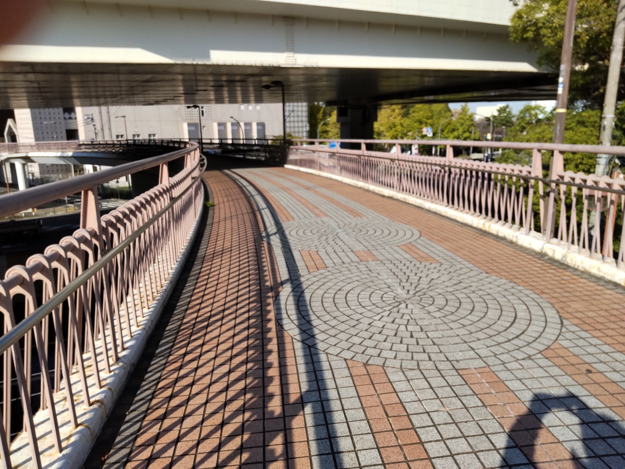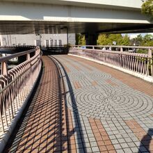 神奈川の橋100選に選ばれた美しい橋で、ベージュ色のタイルが歩道橋に敷いてあります。全長140Mもある歩道橋で、観光客以外にも地元の方がジョギングするのにも使うようです。