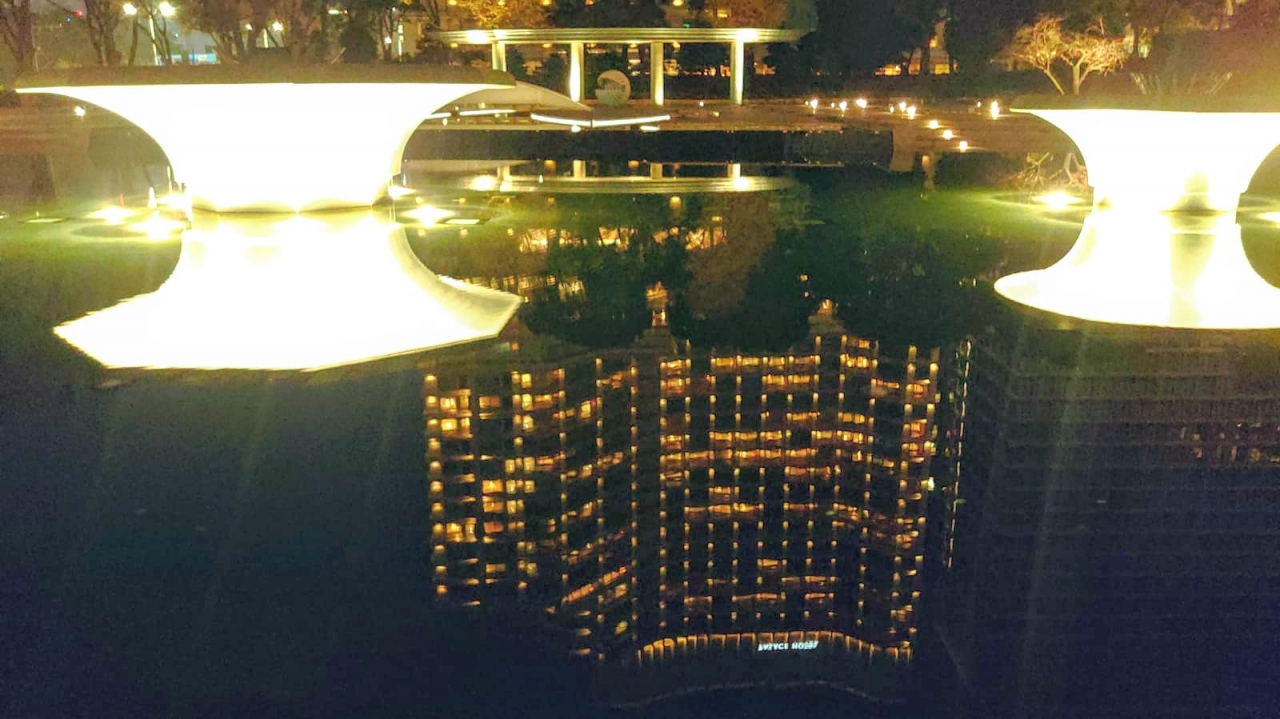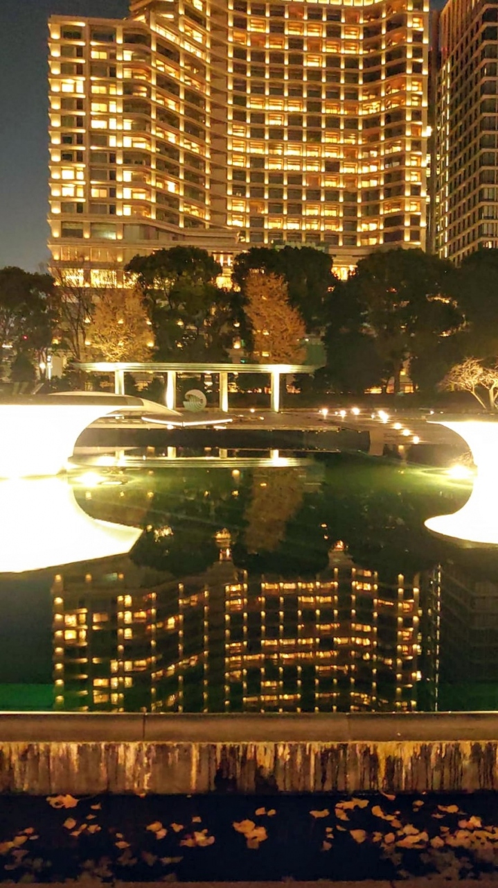 噴水は出ていなかったのでパレスホテルの客室の灯りが公園の水面に移り、幻想的で美しい情景を作り出していました。