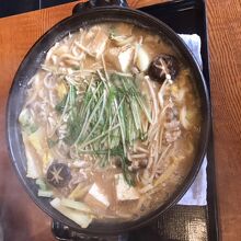 すごいボリュームでしたが美味しく完食できました。具は豚肉に白菜エノキ椎茸ごぼうなど、味噌味です。