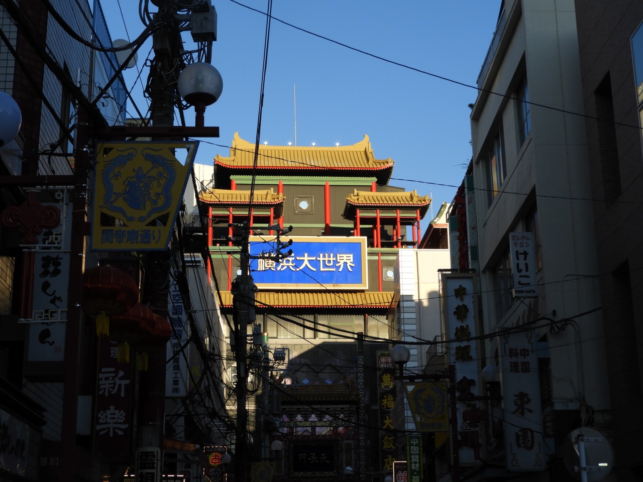 8階建の中華風ビル、”横浜大世界”を見上げる位置に立っています。