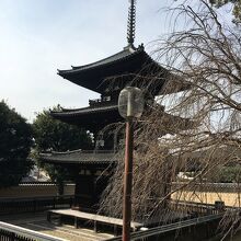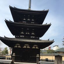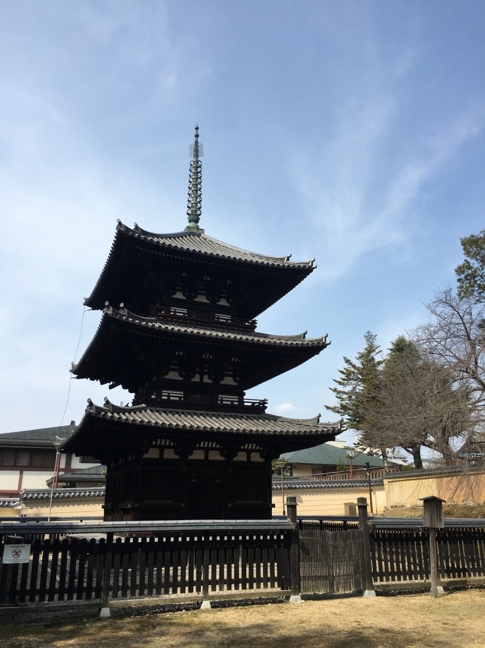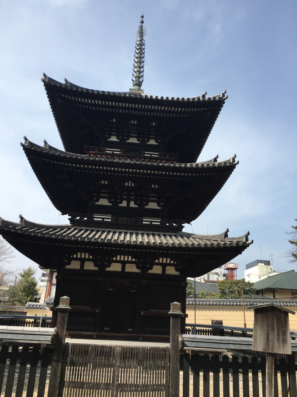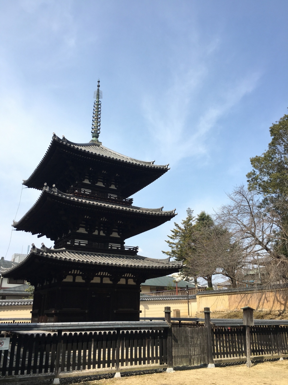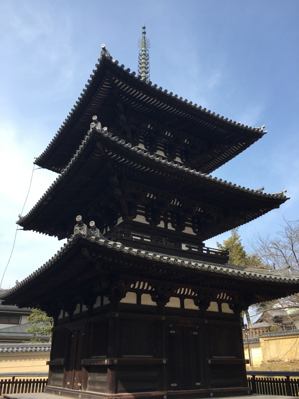 猿沢池から行くと階段を上がり途中左側に逸れる道の正面付近にありました。年季がある塔で、囲いに囲まれて3つの屋根が目立つ塔で、境内にある五重塔と比べ、低いせいか雰囲気が異なっているような感じでした。あまり見上げることをしなくても良い高さでした。