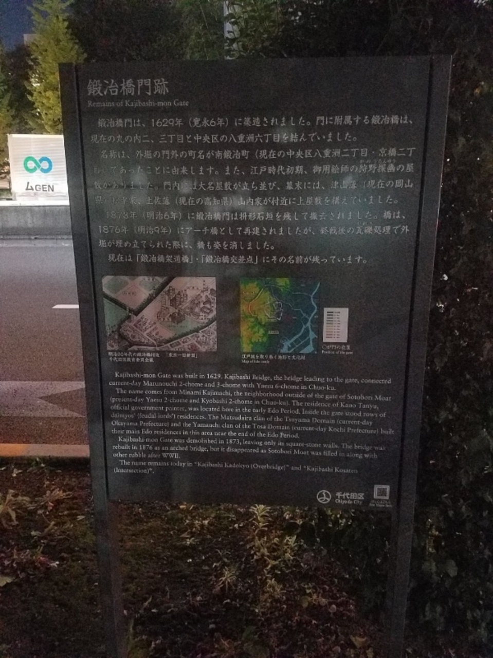 東京駅の北側で常盤橋門跡を見た後に東京駅を素通りして駅南側の鍛冶橋交差点まで歩いて説明版を見つけました。八丁堀でも見かけた鍛冶橋通りが外堀通りと交わるところですね。確かに常盤橋門と鍛冶橋を結ぶように外堀りがあったのだなと歩いて実感できた有意義な散策でした。