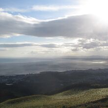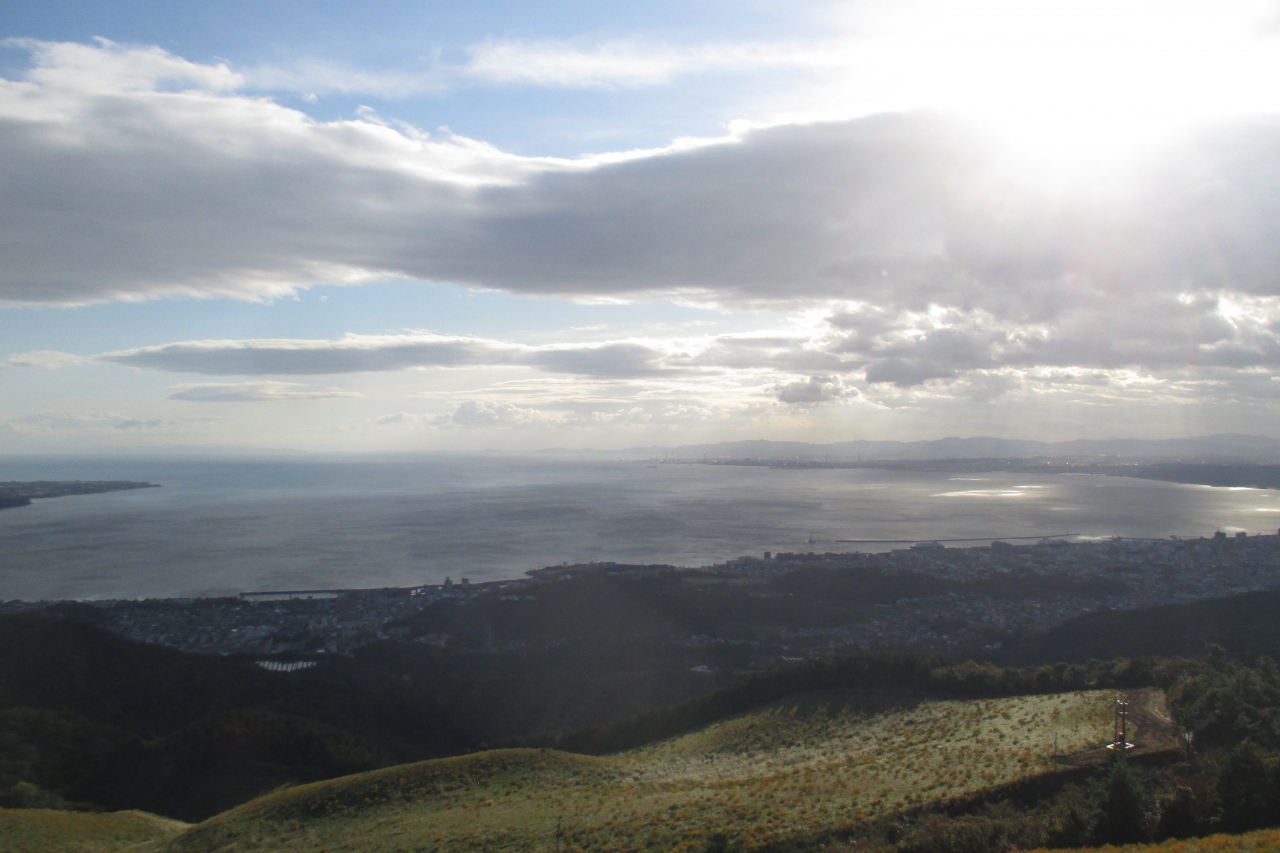 十文字原展望台から眺めると、別府湾の北側の湾口は国東半島ですから丸みがあって見えませんが、南側の湾口・佐賀関半島の先端が霞んで見えました。その佐賀関半島の先端は、ここから35kmくらいありますから、別府湾の奥行きの深さが分ります。これが最深部の別府にあるビーチがみんな波静かな訳ですね。