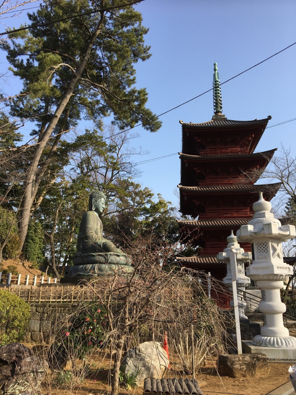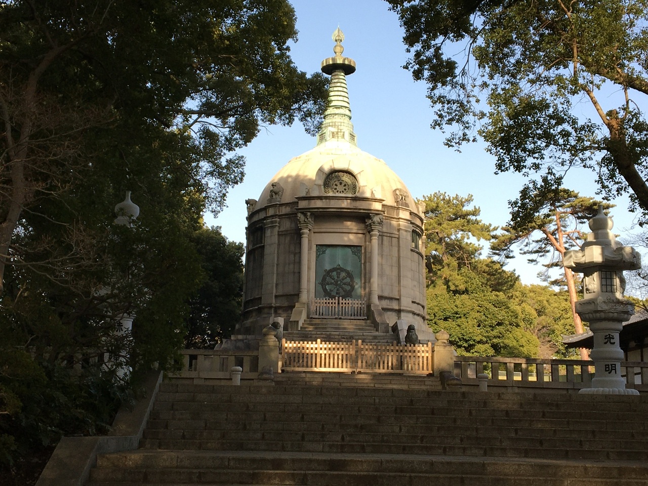 京成中山駅を出ると、すぐに参道で、立派な山門が見えました。山門をくぐると、両脇には小さなお寺が並び、ようやくお寺に到着。境内に入ると、重要文化財に指定されている祖師堂、中山大仏や五重塔など、見どころがたくさんありました。奥に進むと、仏塔のような聖教殿が森の中にあり神秘的でした。