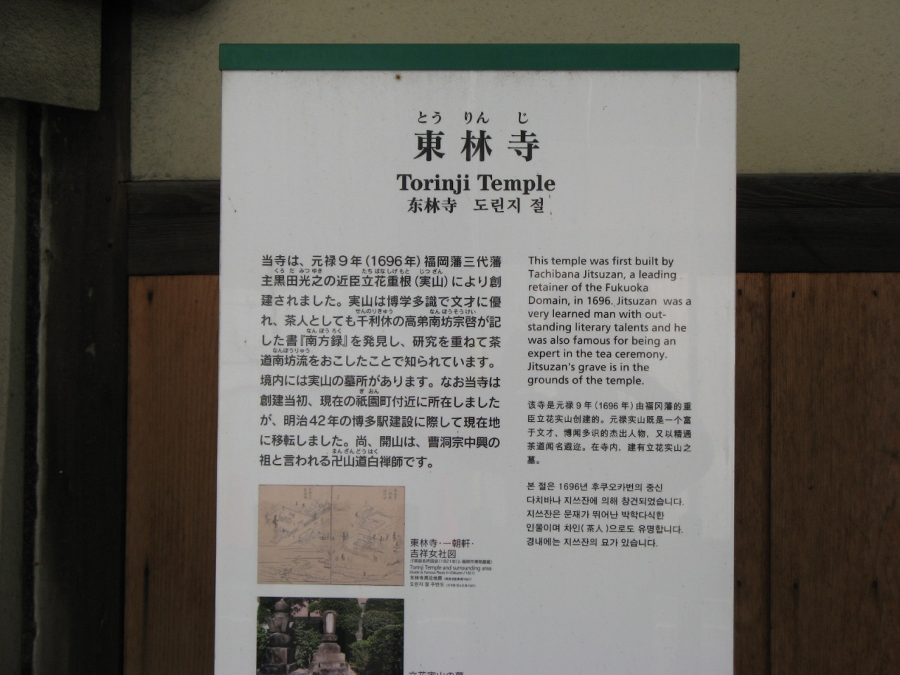 JR博多駅から歩いて5分ほどのところにある曹洞宗のお寺さんです。現地にあった説明板によると、1696年(元禄9年)に福岡藩三代藩主黒田光之に仕えた重鎮・立花重根(実山)によって創建されたとか。一般には公開していない様で今回の訪問時には山門が閉じられていて境内に入れず参拝できず残念でした。