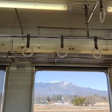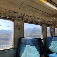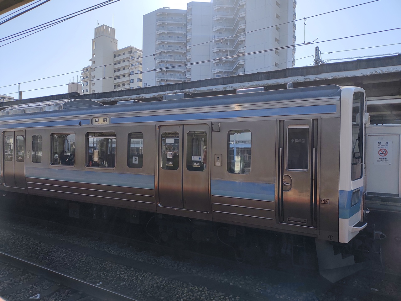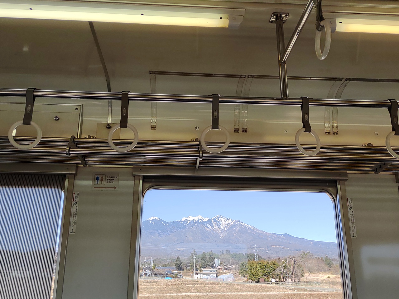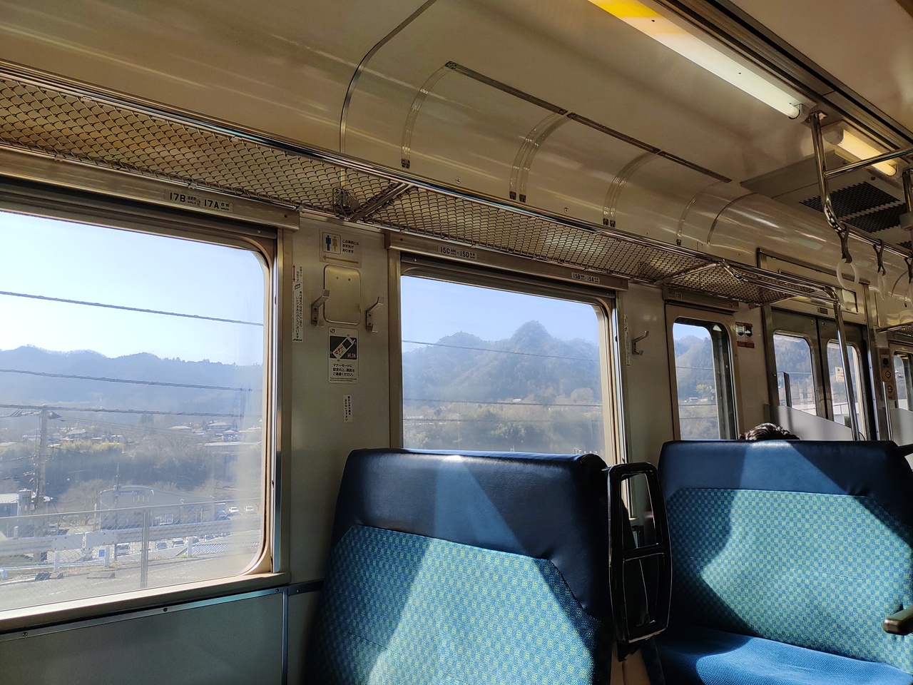 のんびり車窓の風景楽しみながら、乗車できました。普通車は、高尾までは6両くらいあり、高尾から甲府は3両でした。座席はボックス席と、二人掛けの横並びの席がありました。車内で飲食する方々もいるくらい、のんびりでした。