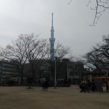 東京スカイツリーが近く、団地などに遮られているものの上部をはっきりと見ることができた。