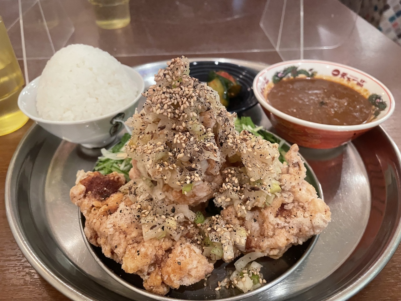 中崎町で有名なスパイスカレー屋さんがボリューム満点の定食を始めたと知り行ってみました。クミンの唐揚げとキーマカレーの定食を。唐揚げは大きなサイズで3つ。ジューシーで美味しい!カレーも旨味が詰まっててご飯が進みます。