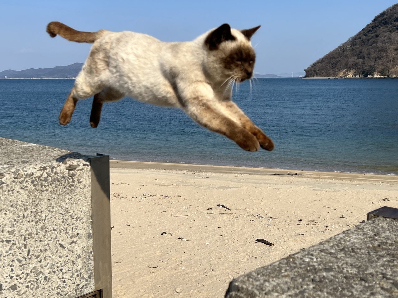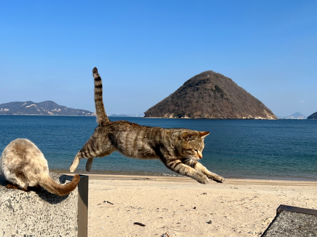 香川、多度津港からフェリーで高見島を経由して50分で本浦港に到着。港に着いてフェリーを下りると出迎えてくれるのは島の猫達です。ここは『飛び猫』で有名な猫島で、島民より猫の数の方が多いそうです。