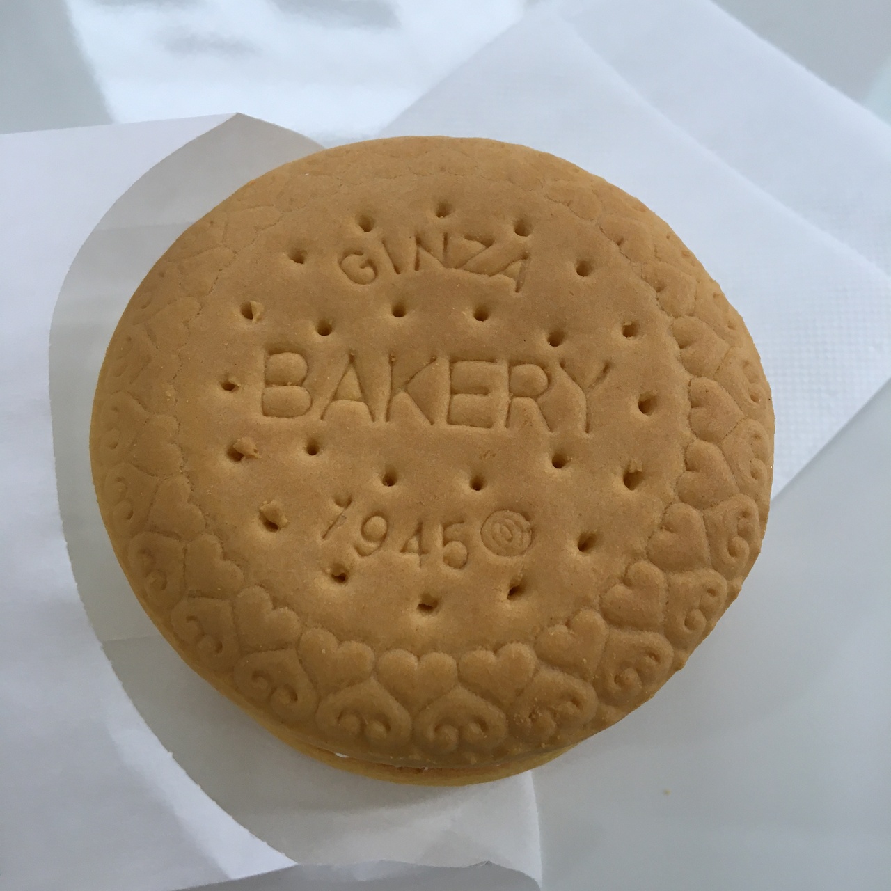 魚の定食が人気の三州屋さんのすぐ目の前にお店があります。カステラビスケットサンドのプレーン(360円)を注文。2階のイートインで食べることができます。日曜日の15時過ぎに来店した時には、イートインには誰もいませんでした。クッキーのような見た目なのでサクっとした歯ごたえを想像していたら、パンみたいにふんわりしていて意外でした。クリームは甘すぎず、ペロリと食べられました。