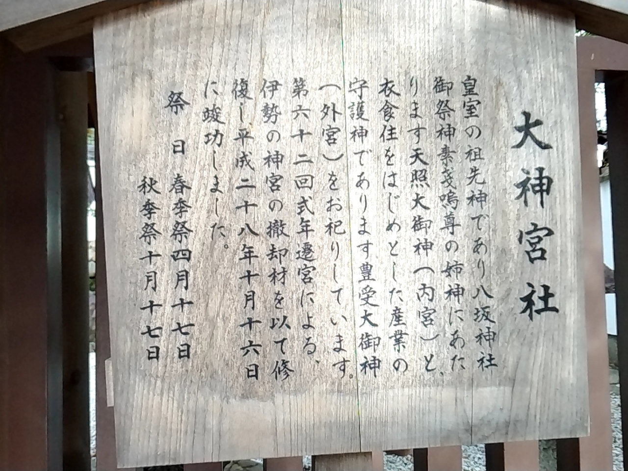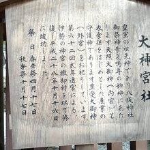 境内の比較的中央当たりだったように思います。社の前に大神宮社についての説明版がありました。そこには、「皇室の祖先神であり、」という記載がありました。よく理解できていないのですが、高貴な社なのかもしれません。