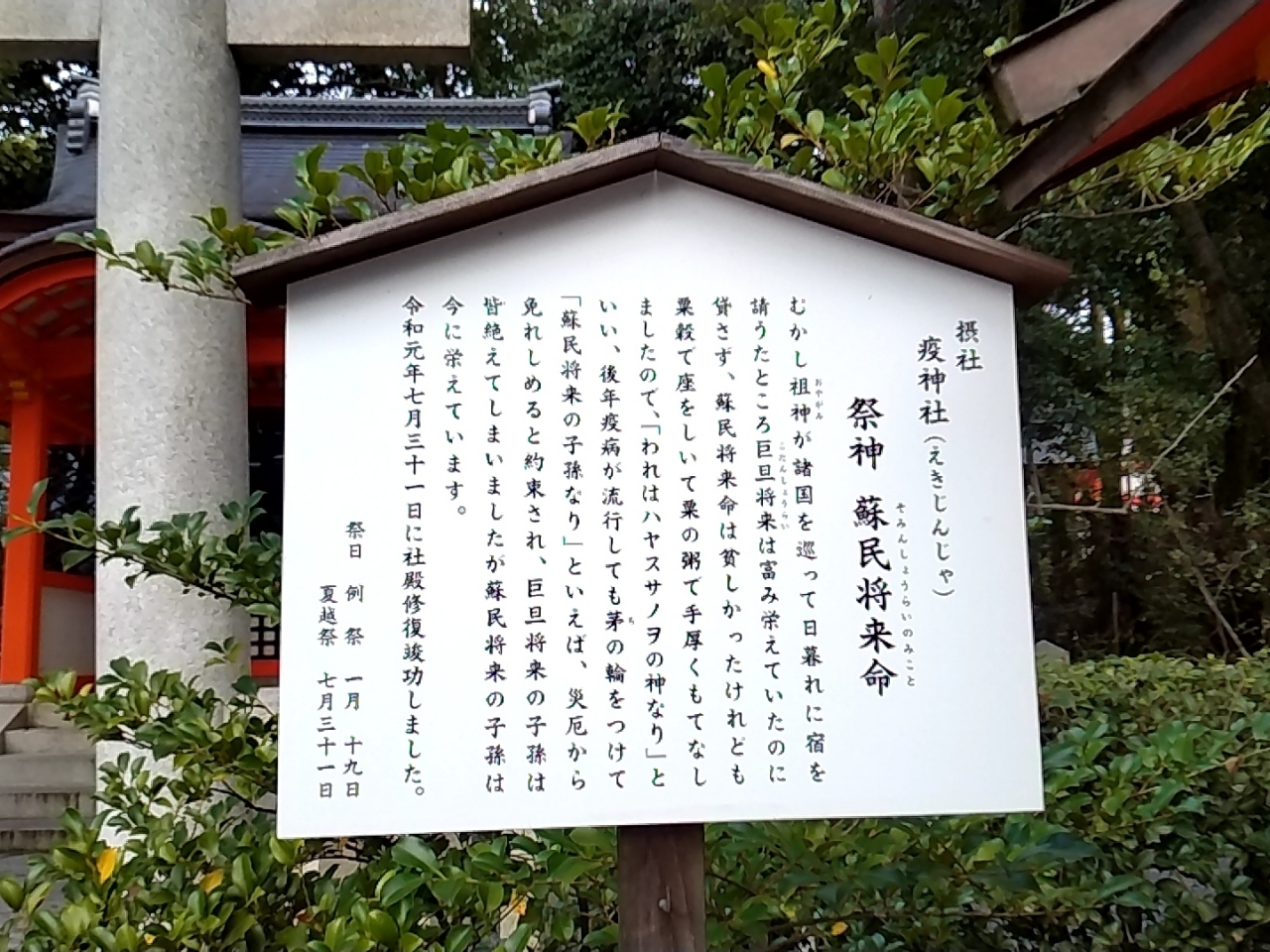 「疫神社」という名前から想像できると思いますが、疫病退散の御利益のある神様として信仰されているようです。蘇民将来命(そみんしょうらいのみこと)が御祭神です。