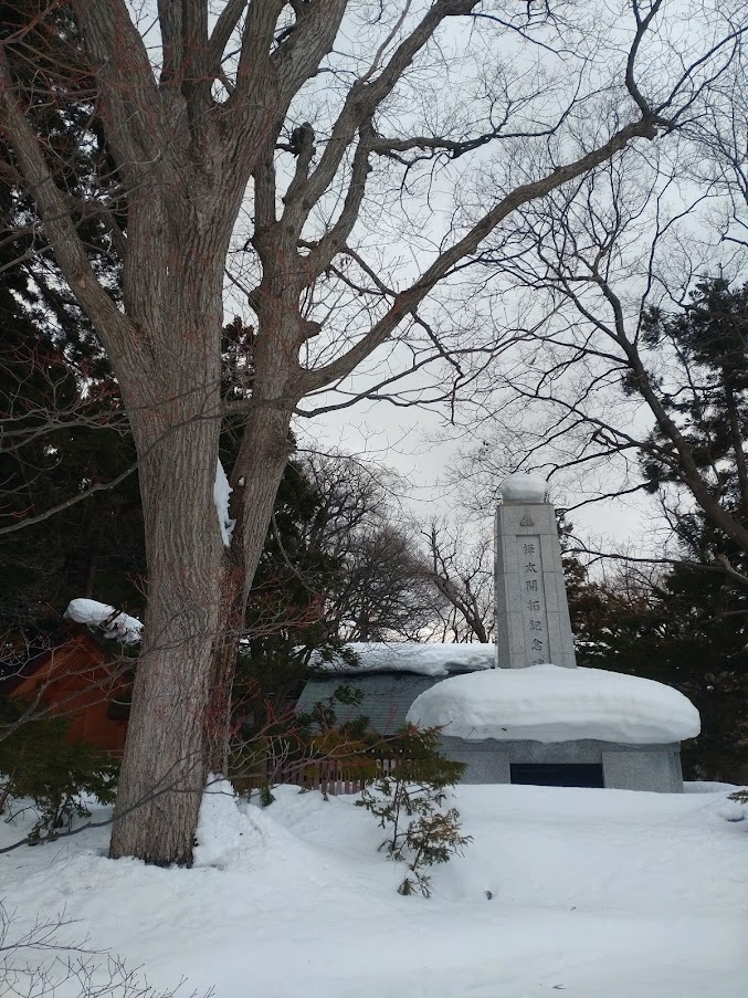開拓神社の横にある記念碑です。雪が深くて近くに寄ることができず、本来の大きさを感じることはできませんでしたが、夏の写真を見てびっくり。ある意味、厳冬の北の大地を開拓する厳しさを想像することができました。
