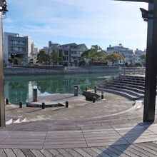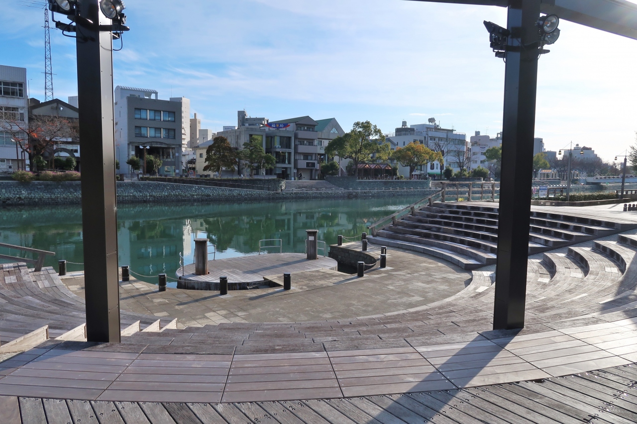 新町橋を眉山方面へ渡ると、ステージのような木の広場があり、そこから新町川沿いが木の遊歩道になっていました。新町川の水辺の景色を眺めながら、朝の散歩を楽しみました。訪れた時はがらんとした川辺の空間でしたが、毎月、最終日曜日には、とくしまマルシェが開かれて、にぎやかになるようです。京都をはじめ関西の食を支えている、徳島食材が味わえる人気のイベント、最終日曜日に徳島市に滞在する場合は、要チェックです。