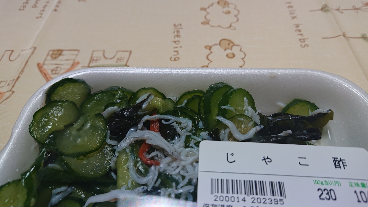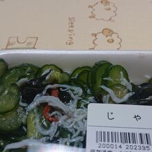 つけた、「じゃこ酢」を購入しました。内容は、じゃこときゅうりの酢合え。あっさり味で、おいしくいただけました。