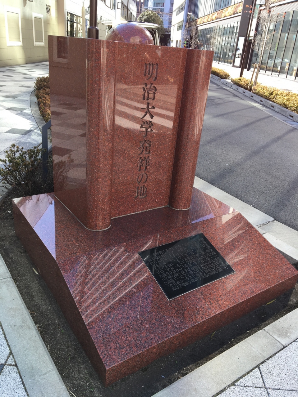 有楽町駅のすぐ近く、数寄屋橋交差点とGINZA5の横くらいの場所に「明治大学発祥の地」と書かれた石碑がありました。明治大学というと、御茶ノ水駅の近くにキャンパスがあるというイメージがあったので、有楽町が発祥と知って意外でした。